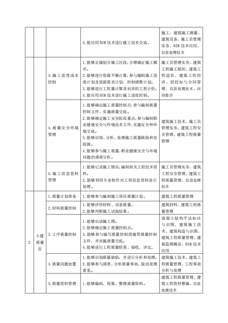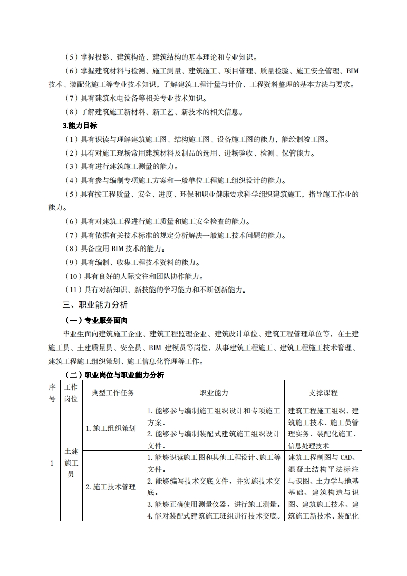 高等职业技术教育《建筑工程技术》专业人才培养方案(普招三年制)专业代码:540301一、学制及招生对象(一)学制:三年。(二)招生对象:高中(中职)毕业生。(三)招生类型:理科。二、培养目标与人才规格(一)培养目标本专业培养德、智、体、美、劳全面发展,具有较高综合素质、良好职业道德、创新精神和创业意识,掌握建筑材料、识图、测量、施工工艺、项目管理、M建筑信息模型等专业知识,具备识图、施工测量、工程技术文件编制、BM建模及施工现场管理能力,在建筑工程施工、工程管理等企业的施工员、安全员、质量员、M建模师等岗位,从事施工组织策划、施工技术管理、施工进度成本控制、质量安全环境管理、施工信息化管理等工作的生产、建设、服务和管理第一线需要的高素质技术技能人才。(二)人才规格1.素质目标(1)思想政治素质:拥护党的基本路线,具有坚定正确的政治方向:掌握毛泽东思想和邓小平理论以及“三个代表”的重要思想和科学发展观:具有正确的世界观、人生观和价值观,具有良好的诚信品质、敬业精神、责任意识、团队意识和诚信意识,格守公民基本道德规范。(2)职业素质:具有良好的职业安全、环境保护意识、职业道德、创新精神、创业意识,能够立足生产、建设、管理、服务一线,踏实进取,敬业奉献,善于合作,敢于竞争,勇于创新。(3)人文科学素质:具有宽阔的视野、良好的科学思维品质、高雅的审美情趣和正确的审美观:能够正确认识社会、主动适应社会,有较强文字和语言表达能力,有较强的人际交往能力和自我发展能力。(4)身体心理素质:具有健康的身体,良好的生活习惯,爱好体育运动,有一定的运动基础。具有健康积极的人生态度,良好的个性心理品质,有较强的心理调适能力和抗挫折能力。2知识目标(1)具有必须的公共英语听、说、读、写基本知识和职业英语知识:(2)具有必备的文化基础知识和人文社会科学知识:(3)具有计算机应用的基本知识:(4)具有本专业所必需的写作,数学、力学、信息技术、建设工程法律法规等知识。