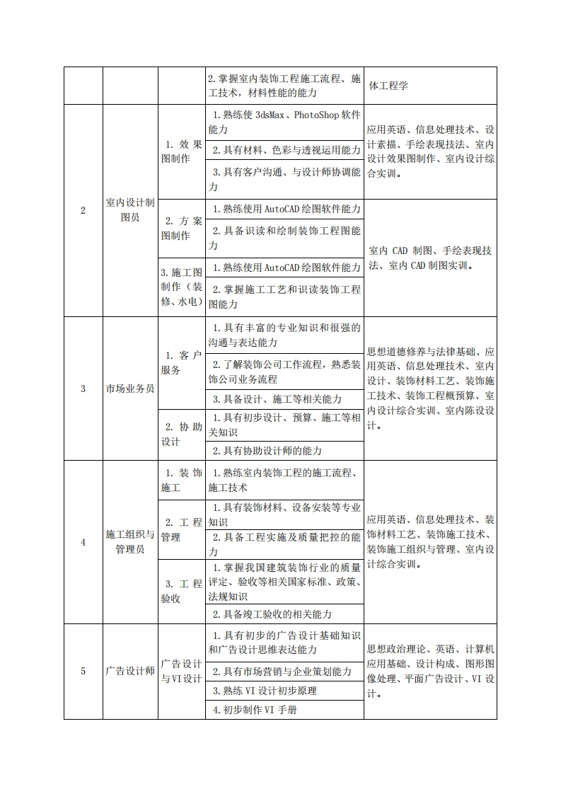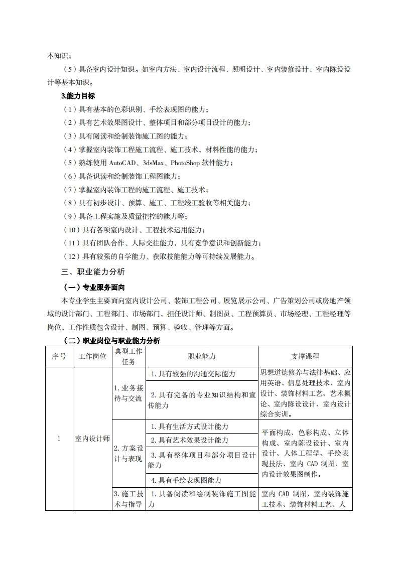 高等职业技术教育《建筑室内设计》专业人才培养方案(普招三年制)专业代码:540104一、学制及招生对象(一)学制:三年。(二)招生对象:高中(中职)毕业生。(三)招生类型:文理兼收。二、培养目标与人才规格(一)培养目标本专业培养德、智、体、美、劳全面发展,具有较高综合素质、良好职业道德、创新精神和创业意识,掌握室内设计、室内装饰工程施工流程、施工技术、绘图软件、艺术效果图设计、预算等知识,具备室内设计、工程技术运用能力,能在建筑室内设计公司、室内装饰公司、展览展示公司及建筑房地产等领域,从事室内设计、电脑设计图纸表现、展览展示设计、装饰工程预决算及施工组织与管理需要的高素质技术技能人才。(二)人才规格1.素质目标(1)思想政治素质:拥护党的基本路线,具有坚定正确的政治方向;掌握毛泽东思想和邓小平理论以及“三个代表”的重要思想和科学发展观;具有正确的世界观、人生观和价值观,具有良好的诚信品质、敬业精神、责任意识、团队意识和诚信意识,格守公民基本道德规范。(2)职业素质:具有良好的职业安全、环境保护意识、职业道德、创新精神、创业意识,能够立足生产、建设、管理、服务一线,踏实进取,敬业奉献,善于合作,敢于竞争,勇于创新。(3)人文科学素质:具有宽阔的视野、良好的科学思维品质、高雅的审美情趣和正确的审美观:能够正确认识社会、主动适应社会,有较强文字和语言表达能力,有较强的人际交往能力和自我发展能力。(4)身体心理素质:具有健康的身体,良好的生活习惯,爱好体育运动,有一定的运动基础。具有健康积极的人生态度,良好的个性心理品质,有较强的心理调适能力和抗挫折能力。2.知识目标(1)具备文化基础知识和人文社会科学知识。如:语文、英语、计算机应用的基本知识(2)具备专业基础知识。如:设计素描、设计概论、三大构成的基本知识:(3)具备专业技术知识。如:工程制图、AutoCAD制图、3Dmax制图、图形图像处理、手绘表现技法的基本知识:(4)具备专业工艺知识。如装饰施工技术、室内组织与管理、工程概预算、装饰材料工艺的基