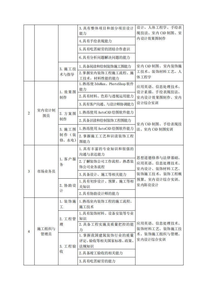 高等职业技术教育《建筑室内设计》专业人才培养方案(普招三年制)专业代码:440106一、学制及招生对象(一)学制:三年。(二)招生对象:高中毕业生。(三)招生类型:文理兼收。二、培养目标与人才规格(一)培养目标本专业培养德、智、体、美、劳全面发展,具有较高综合素质、良好职业道德、创新精神和创业意识,掌握室内设计、室内装饰工程施工流程、施工技术、绘图软件、艺术效果图设计、预算等知识,具备室内设计、工程技术运用能力,能在建筑室内设计公司、室内装饰公司、展览展示公司及建筑房地产等领域,从事室内设计、电脑设计图纸表现、展览展示设计、装饰工程预决算及施工组织与管理需要的高素质技术技能人才。(二)人才规格1.素质目标(1)思想政治素质:系统掌握马克思主义基本原理和马克思主义中国化理论成果,了解党史、新中国史、改革开放史、社会主义发展史,认识世情、国情、党情,深刻领会习近平新时代中国特色社会主义思想,培养运用马克思主义立场观点方法分析和解决问题的能力;自觉践行社会主义核心价值观,尊重和维护宪法法律权威,识大局、尊法治、修美德;矢志不渝听党话跟党走,争做社会主义合格建设者和可靠接班人。(2)职业素质:具有良好的职业安全、环境保护意识、职业道德、创新精神、创业意识,能够立足生产、建设、管理、服务一线,踏实进取,敬业奉献,善于合作,敢于竞争,勇于创新。(3)人文科学素质:具有宽阔的视野、良好的科学思维品质、高雅的审美情趣和正确的审美观:能够正确认识社会、主动适应社会,有较强文字和语言表达能力,有较强的人际交往能力和自我发展能力。(4)身体心理素质:具有健康的身体,良好的生活习惯,爱好体育运动,有一定的运动基础。具有健康积极的人生态度,良好的个性心理品质,有较强的心理调适能力和抗挫折能力。2.知识目标(1)具备文化基础知识和人文社会科学知识。如:语文、英语、计算机应用的基本知识:(2)具备专业基础知识。如:设计素描、设计概论、三大构成的基本知识: