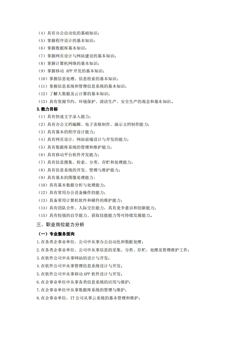 高等职业技术教育《计算机信息管理》专业人才培养方案(普招三年制)专业代码:610203一、学制及招生对象(一)学制:三年。(二)招生对象:高中(中职)毕业生。(三)招生类型:文理兼收。二、培养目标及人才规格(一)培养目标本专业培养德、智、体全面发展,具有较高综合素质、良好职业道德、创新精神和创业意识,掌握办公自动化基础知识,信息的采集、分类、管理及传播、信息系统的设计与开发、数据库原理,网站设计与建设,移动平台软件开发技术,大数据及云计划等基本知识:具备办公自动化、数据分析与处理、信息系统的设计、开发与维护、移动APP开发,数据库系统管理,大数据及云计算平台的基本应用等能力:在政府部门、事业单位、各类企业等单位从事信息采集、分类和处理、信息传播与信息媒体的应用、信息系统开发与维护、数据库系统的管理、移动APP开发,大数据及云平台的应用与维护等生产、建设、服务和管理第一线需要的高素质技术技能人才。(二)人才规格1.素质目标(1)思想政治素质:拥护党的基本路线,具有坚定正确的政治方向:掌握毛泽东思想和邓小平理论以及“三个代表”的重要思想和科学发展观:具有正确的世界观、人生观和价值观,具有良好的诚信品质、敬业精神、责任意识、团队意识和诚信意识,恪守公民基本道德规范。(2)职业素质:具有良好的职业安全、环境保护意识、职业道德,创新精神,创业意识,能够立足生产、建设、管理、服务一线,踏实进取,敬业奉献,善于合作,敢于竞争,勇于创新。(3)人文科学素质:具有宽阔的视野、良好的科学思维品质、高雅的审美情趣和正确的审美观:能够正确认识社会、主动适应社会,有较强文字和语言表达能力,有较强的人际交往能力和自我发展能力。(4)身体心理素质:具有健康的身体,良好的生活习惯,爱好体育运动,有一定的运动基础。具有健康积极的人生态度,良好的个性心理品质,有较强的心理调适能力和抗挫折能力。描述从事本专业及相关专业工作必须的主要基础理论和专门知识。2.知识目标(1)具有必须的公共英语听、说、读、写基本知识和职业英语知识:(2)具有必备的文化基础知识和人文社会科学知识:(3)具有计算机应用的基本知识: