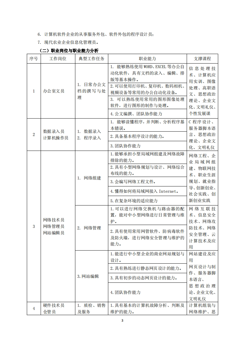 高等职业技术教育《计算机应用技术》专业人才培养方案(普招三年制)专业代码:610201一、学制及招生对象(一)学制:三年。(二)招生对象:高中(中职)毕业生。(三)招生类型:理科。二、培养目标与人才规格(一)培养目标本专业培养德、智、体全面发展,具有较高综合素质、良好职业道德、创新精神和创业意识,掌握计算机组成、网络基本原理、网络管理、网站建设、网络安全相关知识,具备常用办公软件应用、计算机组装与维护、网络组建与维护、网站建设与维护、网络管理能力,在各个与计算机相关的行业领域,从事计算机办公自动化应用、计算机销售与售后服务、网络组建、网络维护与管理、网页设计与制作、网站维护与管理等工作的生产、建设、服务和管理第一线需要的高素质技术技能人才。(二)人才规格1.素质目标(1)思想政治素质:拥护党的基本路线,具有坚定正确的政治方向:掌握毛泽东思想和邓小平理论以及“三个代表”的重要思想和科学发展观:具有正确的世界观、人生观和价值观,具有良好的诚信品质、敬业精神、责任意识、团队意识和诚信意识,恪守公民基本道德规范。(2)职业素质:具有良好的职业安全、环境保护意识、职业道德、创新精神、创业意识,能够立足生产、建设、管理、服务一线,踏实进取,敬业奉献,善于合作,敢于竞争,勇于创新。(3)人文科学素质:具有宽阔的视野、良好的科学思维品质、高雅的审美情趣和正确的审美观:能够正确认识社会、主动适应社会,有较强文字和语言表达能力,有较强的人际交往能力和自我发展能力。(4)身体心理素质:具有健康的身体,良好的生活习惯,爱好体育运动,有一定的运动基础。具有健康积极的人生态度,良好的个性心理品质,有较强的心理调适能力和抗挫折能力。2.知识目标(1)具有必须的公共英语听、说、读、写基本知识和职业英语知识:(2)具有必备的文化基础知识和人文社会科学知识:(3)具有计算机应用的基本知识:(4)具有必需的程序设计思想、软件设计流程等基础知识: