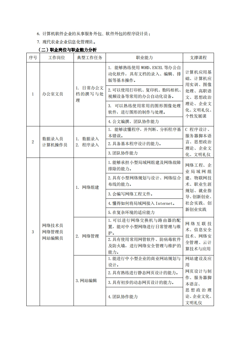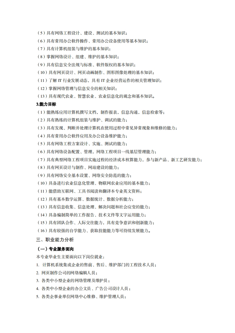 高等职业技术教育《计算机应用技术》专业人才培养方案(普招三年制)专业代码:610201一、学制及招生对象(一)学制:三年。(二)招生对象:高中(中职)毕业生。(三)招生类型:理科。二、培养目标与人才规格(一)培养目标本专业培养德、智、体、美、劳全面发展,具有较高综合素质、良好职业道德、创新精神和创业意识,掌握计算机组成、网络基本原理、网络管理、网站建设、网络安全相关知识,具备常用办公软件应用、计算机组装与维护、网络组建与维护、网站建设与维护、网络管理能力,在各个与计算机相关的行业领域,从事计算机办公自动化应用、计算机销售与售后服务、网络组建、网络维护与管理、网页设计与制作、网站维护与管理等工作的生产、建设、服务和管理第一线需要的高素质技术技能人才。(二)人才规格1素质目标(1)思想政治素质:拥护党的基本路线,具有坚定正确的政治方向:掌握毛泽东思想和邓小平理论以及“三个代表”的重要思想和科学发展观:具有正确的世界观、人生观和价值观,具有良好的诚信品质、敬业精神、责任意识、团队意识和诚信意识,恪守公民基本道德规范。(2)职业素质:具有良好的职业安全、环境保护意识、职业道德、创新精神、创业意识,能够立足生产、建设、管理、服务一线,踏实进取,敬业奉献,善于合作,敢于竞争,勇于创新。(3)人文科学素质:具有宽阔的视野、良好的科学思维品质、高雅的审美情趣和正确的审美观:能够正确认识社会、主动适应社会,有较强文字和语言表达能力,有较强的人际交往能力和自我发展能力。(4)身体心理素质:具有健康的身体,良好的生活习惯,爱好体育运动,有一定的运动基础。具有健康积极的人生态度,良好的个性心理品质,有较强的心理调适能力和抗挫折能力。2.知识目标(1)具有必须的公共英语听、说、读、写基本知识和职业英语知识:(2)具有必备的文化基础知识和人文社会科学知识:(3)具有计算机应用的基本知识:(4)具有必需的程序设计思想、软件设计流程等基础知识: