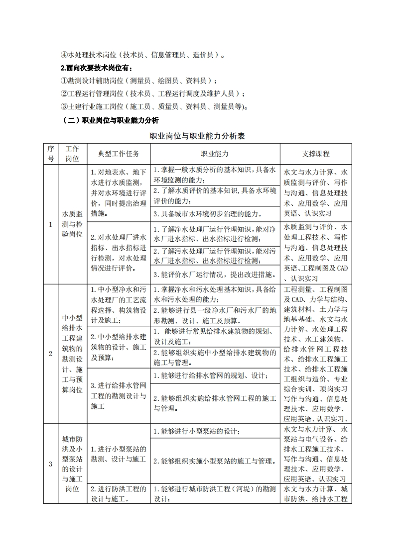 高等职业技术教育《给排水工程技术》专业人才培养方案(普招三年制)专业代码:440602一、学制及招生对象(一)学制:三年(二)招生对象:高中(中职)毕业生(三)招生类型:文理兼收二、培养目标与人才规格(一)培养目标本专业培养德、智、体、美、劳全面发展,具有较高综合素质、良好职业道德、创新精神和创业意识,掌握给排水专业的基本知识,具备小城镇给排水工程和防洪工程勘测设计的初步能力、以及给排水工程的施工、施工组织、造价等管理能力,水环境监测、评价及治理等能力,在给排水、城市防洪、市政工程等建设第一线,主要从事给排水、水环境治理、城市防洪、市政建设等工作的生产、建设、服务和管理第一线需要的高素质技术技能人才。(二)人才规格1.素质目标(1)思想政治素质:系统掌握马克思主义基本原理和马克思主义中国化理论成果,了解党史、新中国史、改革开放史、社会主义发展史,认识世情、国情、党情,深刻领会习近平新时代中国特色社会主义思想,培养运用马克思主义立场观点方法分析和解决问题的能力;自觉践行社会主义核心价值观,尊重和维护宪法法律权威,识大局、尊法治、修美德;矢志不渝听党话跟党走,争做社会主义合格建设者和可靠接班人。(2)职业素质:具有良好的职业安全、环境保护意识、职业道德、创新精神、创业意识,能够立足生产、建设、管理、服务一线,踏实进取,敬业奉献,善于合作,敢于竞争,勇于创新。(3)人文科学素质:具有宽阔的视野、良好的科学思维品质、高雅的审美情趣和正确的审美观:能够正确认识社会、主动适应社会,有较强文字和语言表达能力,有较强的人际交往能力和自我发展能力。(4)身体心理素质:具有健康的身体,良好的生活习惯,爱好体育运动,有一定的运动基础。具有健康积极的人生态度,良好的个性心理品质,有较强的心理调适能力和抗挫折能力。2.知识目标(1)掌握必备的公共英语听、说、读、写基本知识和职业英语知识;