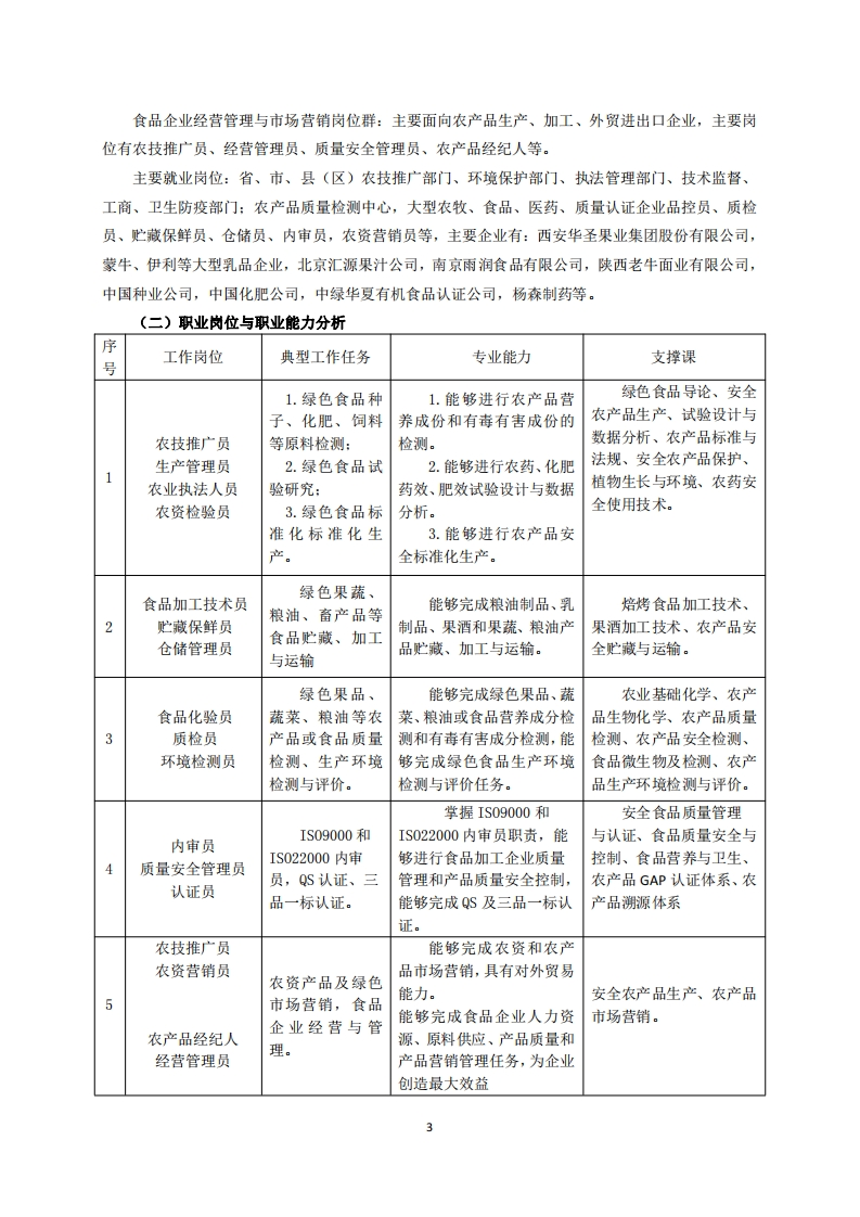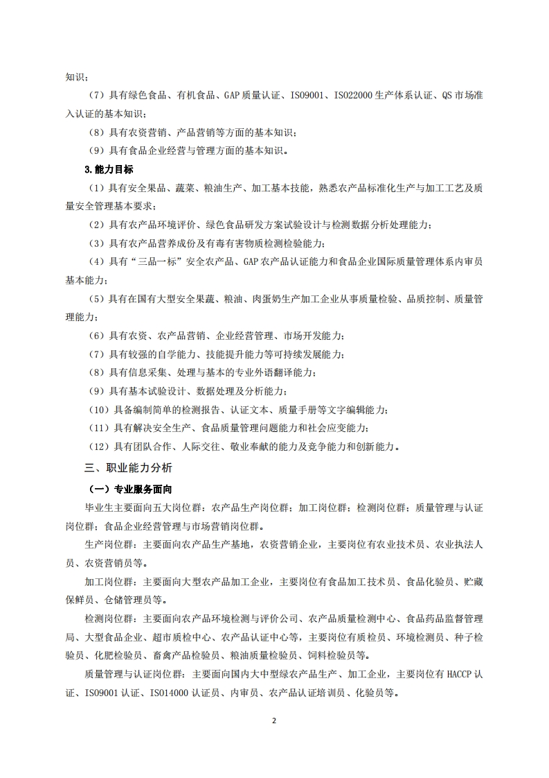 高等职业技术教育《绿色食品生产与检验》专业人才培养方案(普招三年制)专业代码:510114一、学制及招生对象(一)学制:三年。(二)招生对象:高中(中职)毕业生。(三)招生类型:文理兼收。二、培养目标与人才规格(一)培养目标本专业培养德、智、体全面发展,具有较高综合素质、良好职业道德、创新精神和创业意识,掌握农产品标准化生产、加工、检测与认证、质量管理等核心技能,熟悉国家有关农产品质量安全的法律法规,能够在农产品生产、加工、检测、认证、市场营销一线从事生产、加工、检测与认证、环境评价、质量安全管理等工作的生产、建设、服务和管理第一线需要的技术技能人才。(二)人才规格1.素质目标(1)思想政治素质:拥护党的基本路线,具有坚定正确的政治方向:掌握毛泽东思想、邓小平理论、“三个代表”和科学发展观重要思想:具有正确的世界观、人生观和价值观,具有良好的诚信品质、敬业精神、责任意识、团队意识和诚信意识,格守公民基本道德规范。(2)职业素质:具有良好的职业安全、环境保护意识、职业道德、创新精神、创业意识,能够立足生产、建设、管理、服务一线,踏实进取,敬业奉献,善于合作,敢于竞争,勇于创新。(3)人文科学素质:具有宽阔的视野、良好的思维品质、高雅的审美情趣和正确的审美观:能够正确认识社会、主动适应社会,有较强文字和语言表达能力,有较强的人际交往能力和自我发展能力。(4)身体心理素质:具有健康的身体,良好的生活习惯,爱好体育运动,具有健康积极的人生态度,良好的个性心理品质,有较强的心理调适能力和抗挫折能力。2.知识目标(1)具有必备的政治理论、数据分析基础,以及社会与人文知识:(2)具有计算机应用、英语、信息采集与处理等方面的基本知识:(3)具有农业基础化学、植物学、土壤学、微生物学基本知识:(4)具有安全农产品标准化生产、农业投入品规范使用方面的基本知识:(5)具有果蔬、粮油、畜产品(肉、蛋、奶)贮藏加工与质量安全管理方面的基本知识:(6)具有样品采集与处理、样品分析、农产品环境检测、质量检测、微生物检测等方面的基本