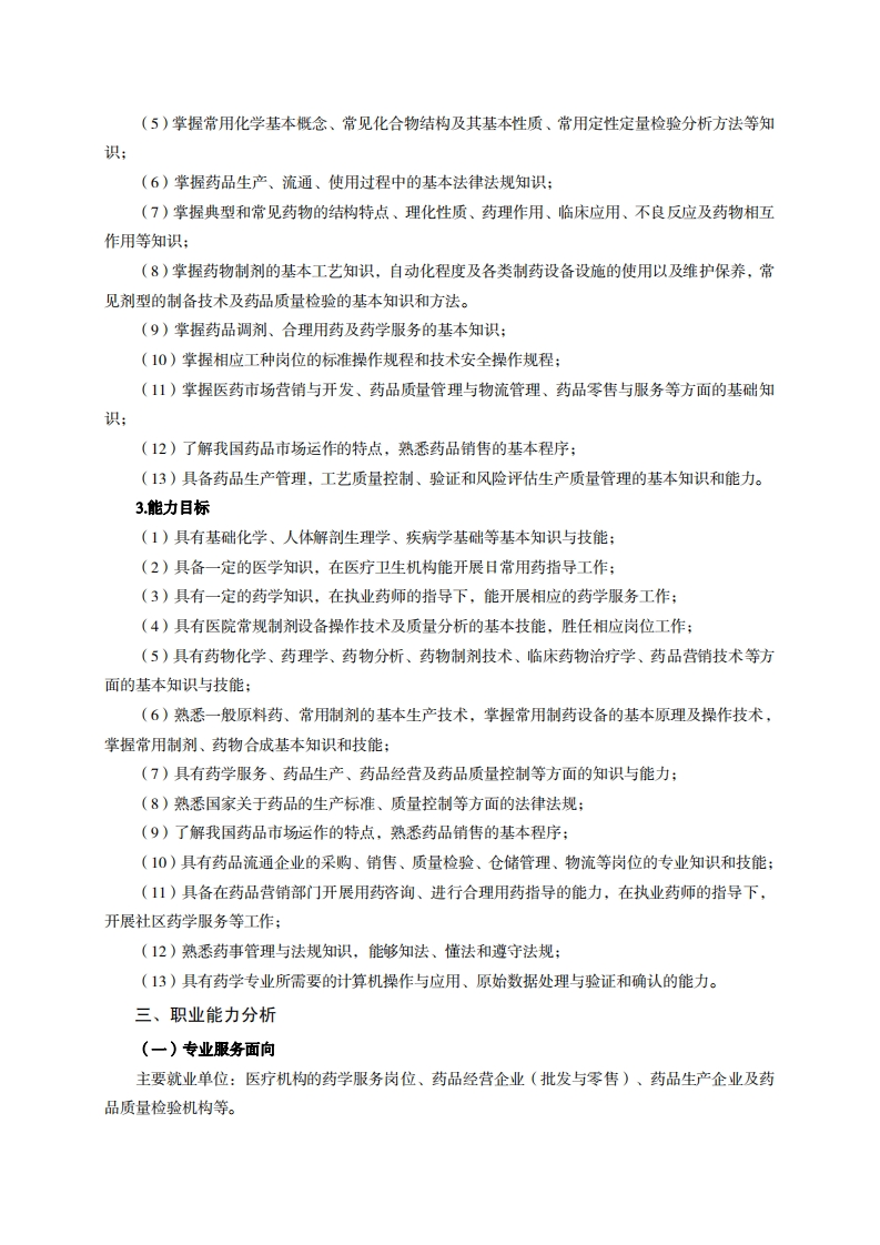 高等职业技术教育《药学》专业人才培养方案(普招三年制)专业代码:520301一、学制及招生对象(一)学制:三年。(二)招生对象:高中(中职)毕业生。(三)招生类型:文理兼收。二、培养目标与人才规格(一)培养目标本专业培养德、智、体、美、劳全面发展,具有较高综合素质、良好职业道德、创新精神和创业意识,掌握药学服务、药品生产和质量检验、药品营销等相关理论知识,具备良好的药学专业服务能力,在医药卫生行业从事药学服务、药品调剂、药品生产、检验以及药品营销等工作的生产、建设、服务和管理第一线需要的高素质技术技能人才。(二)人才规格1.素质目标(1)思想政治素质:系统掌握马克思主义基本原理和马克思主义中国化理论成果,了解党史、新中国史、改革开放史、社会主义发展史,认识世情、国情、党情,深刻领会习近平新时代中国特色社会主义思想,培养运用马克思主义立场观点方法分析和解决问题的能力;自觉践行社会主义核心价值观,尊重和维护宪法法律权威,识大局、尊法治、修美德:矢志不渝听党话跟党走,争做社会主义合格建设者和可靠接班人。(2)职业素质:具有良好的职业安全、环境保护意识、职业道德、创新精神、创业意识,能够立足生产、建设、管理、服务一线,踏实进取,敬业奉献,善于合作,敢于竞争,勇于创新。(3)人文科学素质:具有宽阔的视野、良好的科学思维品质、高雅的审美情趣和正确的审美观:能够正确认识社会、主动适应社会,有较强文字和语言表达能力,有较强的人际交往能力和自我发展能力。(4)身体心理素质:具有健康的身体,良好的生活习惯,爱好体育运动,有一定的运动基础。具有健康积极的人生态度,良好的个性心理品质,有较强的心理调适能力和抗挫折能力。2.知识目标(1)具有必须的公共英语听、说、读、写基本知识和职业英语知识;(2)具有必备的文化基础知识和人文社会科学知识:(3)具有计算机应用的基本知识、文献检索能力:(4)掌握专业所需的医药学基础知识: