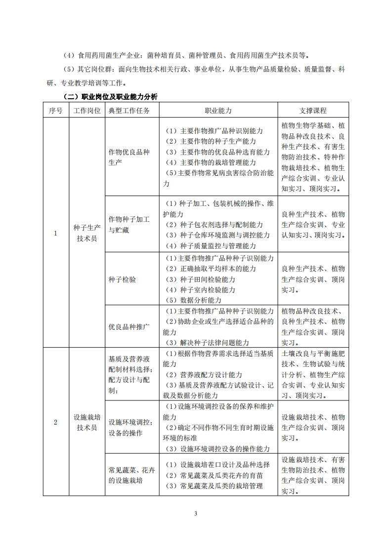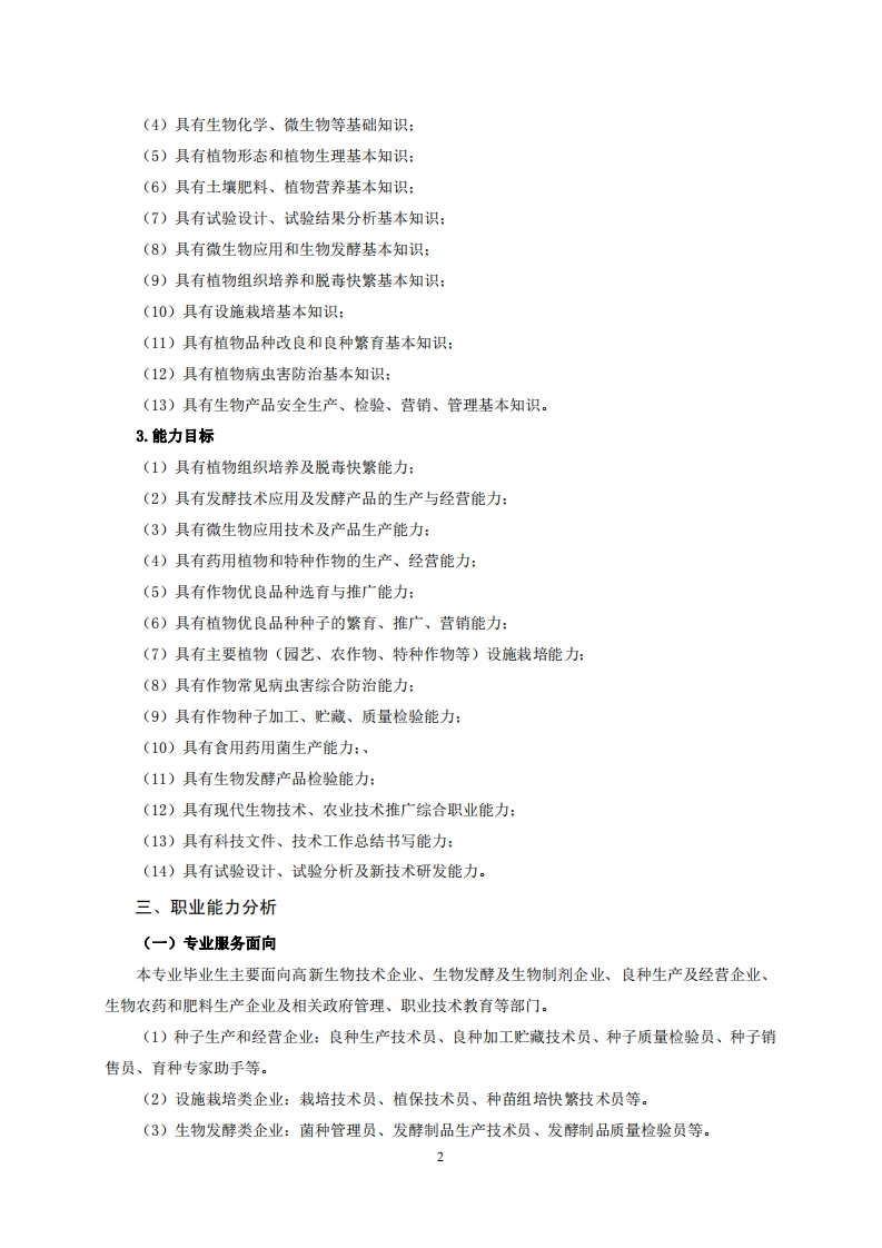 高等职业技术教育《农业生物技术》专业人才培养方案(普招三年制)专业代码:570104一、学制及招生对象(一)学制:三年。(二)招生对象:高中(中职)毕业生。(三)招生类型:文理兼收。二、培养目标与人才规格(一)培养目标本专业培养德、智、体全面发展,具有较高综合素质、良好职业道德、创新精神和创业意识,掌握良种生产、设施栽培、生物发酵和微生物应用等方面的知识,具备植物组培快繁、生物肥料农药使用、生物发酵制品生产、食用药用菌生产等能力,在种子生产和经营企业、设施栽培类企业、生物发酵类企业、食用药用菌生产企业从事产品的生产、检验、管理、销售、协助研发等工作的第一线需要的技术技能人才。(二)人才规格1.素质目标(1)思想政治素质:拥护党的基本路线,具有坚定正确的政治方向:掌握毛泽东思想和邓小平理论以及“三个代表”的重要思想和科学发展观:具有正确的世界观、人生观和价值观,具有良好的诚信品质、敬业精神、责任意识、团队意识和诚信意识,恪守公民基本道德规范。(2)职业素质:具有良好的职业安全、环境保护意识、职业道德、创新精神、创业意识,能够立足生产、建设、管理、服务一线,踏实进取,敬业奉献,善于合作,敢于竞争,勇于创新。(3)人文科学素质:具有宽阔的视野、良好的科学思维品质、高雅的审美情趣和正确的审美观:能够正确认识社会、主动适应社会,有较强文字和语言表达能力,有较强的人际交往能力和自我发展能力。(4)身体心理素质:具有健康的身体,良好的生活习惯,爱好体育运动,有一定的运动基础:具有健康积极的人生态度,良好的个性心理品质,有较强的心理调适能力和抗挫折能力。2.知识目标(1)具有公共英语听、说、读、写基本知识:(2)具有文化基础知识和人文社会科学知识:(3)具有计算机应用基本知识: