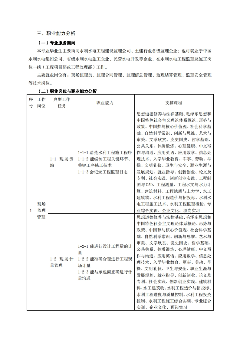 高等职业技术教育《建设工程监理》专业人才培养方案(普招三年制)(水利工程监理方向)专业代码:540505一、学制及招生对象(一)学制:三年。(二)招生对象:高中(中职)毕业生。(三)招生类型:理科。二、培养目标与人才规格(一)培养目标本专业培养德、智、体、美、劳全面发展,具备较高综合素质、良好职业道德、创业意识和创新能力以及职业生涯可持续发展的职业素质,掌握水利水电工程建设监理基本原理及工程建设质量、投资、进度控制和合同管理的知识,具备工程建设一线监理旁站、监理收集整编、安全管理等方面的能力,在水利水电工程及一般土木工程建设施工监理行业从事现场工程监理、信息收集与处理,监理合同与索赔管理,工程结算的初步审核、工程安全监理工作的生产、建设、服务和管理第一线需要的高素质技术技能人才。(二)人才规格1.素质目标(1)思想政治索质:拥护党的基本路线,具有坚定正确的政治方向:掌握毛泽东思想和邓小平理论以及“三个代表”的重要思想和科学发展观:具有正确的世界观、人生观和价值观,具有良好的诚信品质、敬业精神、责任意识、团队意识和诚信意识,恪守公民基本道德规范。(2)职业素质:具有良好的职业安全、环境保护意识、职业道德、创新精神、创业意识,能够立足生产、建设、管理、服务一线,踏实进取,敏业奉献,善于合作,敢于竞争,勇于创新。(3)人文科学素质:具有宽阔的视野、良好的科学思维品质、高雅的审美情趣和正确的审美观:能够正确认识社会、主动适应社会,有较强文字和语言表达能力,有较强的人际交往能力和自我发展能力。(4)身体心理素质:具有健康的身体,良好的生活习惯,爱好体育运动,有一定的运动基础。具有健康积极的人生态度,良好的个性心理品质,有较强的心理调适能力和抗挫折能力。2知识目标(1)具有必须的公共英语听、说、读、写基本知识和职业英语知识: