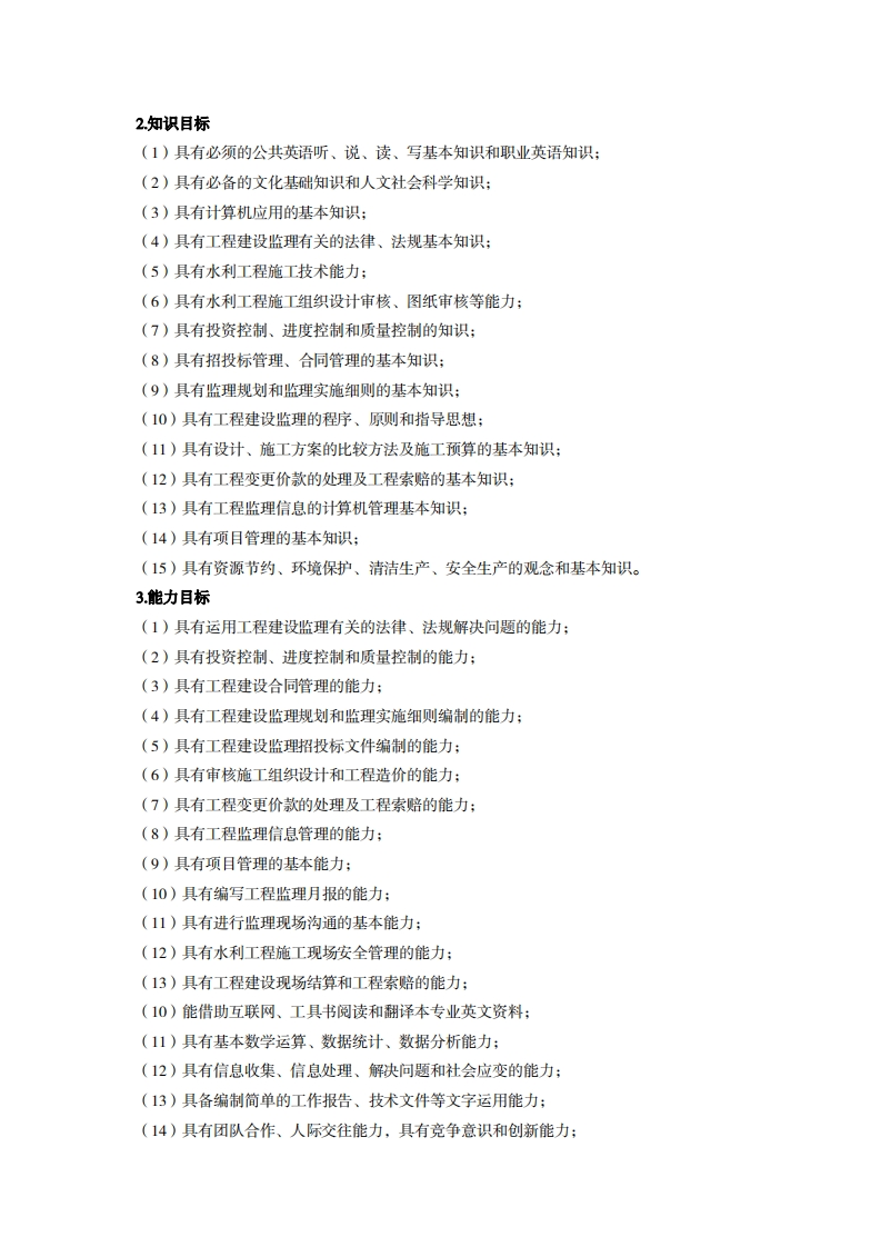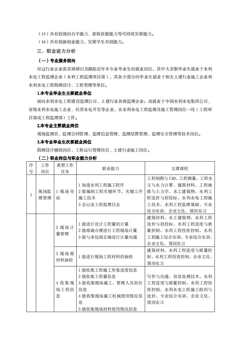 高等职业技术教育《建设工程监理》专业人才培养方案(普招三年制)(水利工程监理方向)专业代码:440504一、学制及招生对象(一)学制:三年。(二)招生对象:高中(中职)毕业生。(三)招生类型:文理兼收。二、培养目标与人才规格(一)培养目标本专业培养德、智、体、美、劳全面发展,具备较高综合素质、良好职业道德、创新精神和创业意识,掌握水利水电工程建设监理知识及工程建设质量、投资、进度控制和合同管理的知识,具备工程建设一线监理旁站、工程现场计量、工程建设资料收集整编、工程进度管理、工程质量评定与管理、工程结算管理、工程验收管理、安全管理以及协助专业监理工程师处理现场事务的能力,在水利水电工程及一般土木工程建设施工监理行业从事现场工程监理、信息收集与处理,监理合同与索赔管理,工程结算的初步审核、工程安全监理工作的生产、建设、服务和管理第一线需要的高素质技术技能人才。(二)人才规格1素质目标(1)思想政治素质:系统掌握马克思主义基本原理和马克思主义中国化理论成果,了解党史新中国史、改革开放史、社会主义发展史,认识世情、国情、党情,深刻领会习近平新时代中国特色社会主义思想,培养运用马克思主义立场观点方法分析和解决问题的能力:自觉践行社会主义核心价值观,尊重和维护宪法法律权威,识大局、尊法治、修美德:矢志不渝听党话跟党走,争做社会主义合格建设者和可靠接班人。(2)职业素质:具有良好的职业安全、环境保护意识、职业道德、创新精神、创业意识,能够立足生产、建设、管理、服务一线,踏实进取,敏业奉献,善于合作,敢于竞争,勇于创新。(3)人文科学素质:具有宽阔的视野、良好的科学思维品质、高雅的审美情趣和正确的审美观;能够正确认识社会、主动适应社会,有较强文字和语言表达能力,有较强的人际交往能力和自我发展能力。(4)身体心理素质:具有健康的身体,良好的生活习惯,爱好体育运动,有一定的运动基础。具有健康积极的人生态度,良好的个性心理品质,有较强的心理调适能力和抗挫折能力。