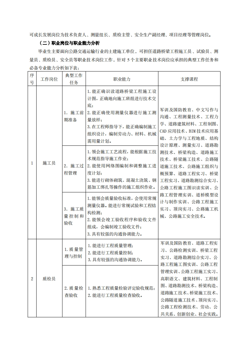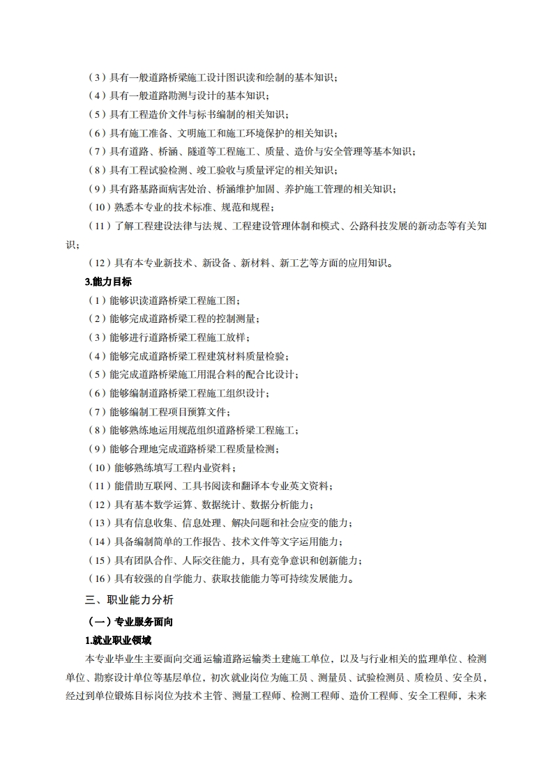 高等职业技术教育《道路与桥梁工程技术》专业人才培养方案(普招三年制)专业代码:500201一、学制及招生对象(一)学制:三年。(二)招生对象:高中(中职毕业生。(三)招生类型:理科。二、培养目标与人才规格(一)培养目标本专业培养德、智、体、美、劳全面发展,具有较高综合素质、良好职业道德、创新精神和创业意识,掌握道路桥梁工程施工设计图纸识读和绘制、路线勘测与设计、道路、桥涵、隧道等工程施工、质量、造价与安全管理等基本知识,具备道路桥梁工程施工图识读和绘制、施工测量放样、建筑材料质量检验、施工组织与管理、质量检查与验收的能力,在公路建设施工、管理一线企业从事道路桥梁工程技术工作的生产、建设、服务和管理第一线需要的高素质技术技能人才。(二)人才规格1.素质目标(1)思想政治素质:系统掌握马克思主义基本原理和马克思主义中国化理论成果,了解党史、新中国史、改革开放史、社会主义发展史,认识世情、国情、党情,深刻领会习近平新时代中国特色社会主义思想,培养运用马克思主义立场观点方法分析和解决问题的能力:自觉践行社会主义核心价值观,尊重和维护宪法法律权威,识大局、尊法治、修美德:矢志不渝听党话跟党走,争做社会主义合格建设者和可靠接班人。(2)职业素质:具有良好的职业安全、环境保护意识、职业道德、创新精神、创业意识,能够立足生产、建设、管理、服务一线,踏实进取,敬业奉献,善于合作,敢于竞争,勇于创新。(3)人文科学素质:具有宽阔的视野、良好的科学思维品质、高雅的审美情趣和正确的审美观:能够正确认识社会、主动适应社会,有较强文字和语言表达能力,有较强的人际交往能力和自我发展能力。(4)身体心理素质:具有健康的身体,良好的生活习惯,爱好体育运动,有一定的运动基础。具有健康积极的人生态度,良好的个性心理品质,有较强的心理调适能力和抗挫折能力。2.知识目标(1)具有必要的思想政治理论知识、法律基础知识、计算机应用知识和一定的人文社会科学知识:(2)具有必须的公共英语听、说、读、写基本知识和职业英语知识: