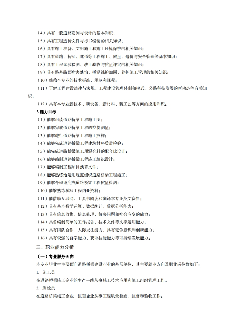 高等职业技术教育《道路桥梁工程技术》专业人才培养方案(普招三年制)专业代码:600202一、学制及招生对象(一)学制:三年。(二)招生对象:高中(中职毕业生。(三)招生类型:理科。二、培养目标与人才规格(一)培养目标本专业培养德、智、体、美、劳全面发展,具有较高综合素质、良好职业道德、创新精神和创业意识,掌握道路桥梁工程施工设计图纸识读和绘制、路线勘测与设计、道路、桥涵、隧道等工程施工、质量、造价与安全管理等基本知识,具备道路桥梁工程施工图识读和绘制、施工测量放样、建筑材料质量检验、施工组织与管理、质量检查与验收的能力,在公路建设施工、管理一线从事道路桥梁工程技术工作的生产、建设、服务和管理第一线需要的高素质技术技能人才。(二)人才规格1.素质目标(1)思想政治素质:拥护党的基本路线,具有坚定正确的政治方向;掌握毛泽东思想和邓小平理论以及“三个代表”的重要思想和科学发展观;具有正确的世界观、人生观和价值观,具有良好的诚信品质、敬业精神、责任意识、团队意识和诚信意识,格守公民基本道德规范。(2)职业素质:具有良好的职业安全、环境保护意识、职业道德、创新精神、创业意识,能够立足生产、建设、管理、服务一线,踏实进取,敬业奉献,善于合作,敢于竞争,勇于创新。(3)人文科学素质:具有宽阔的视野、良好的科学思维品质、高雅的审美情趣和正确的审美观:能够正确认识社会、主动适应社会,有较强文字和语言表达能力,有较强的人际交往能力和自我发展能力。(4)身体心理素质:具有健康的身体,良好的生活习惯,爱好体育运动,有一定的运动基础。具有健康积极的人生态度,良好的个性心理品质,有较强的心理调适能力和抗挫折能力。2.知识目标(1)具有必要的思想政治理论知识、法律基础知识、计算机应用知识和一定的人文社会科学知识:(2)具有一定的高职实用英语知识;(3)具有一般道路桥梁施工设计图识读和绘制的基本知识: