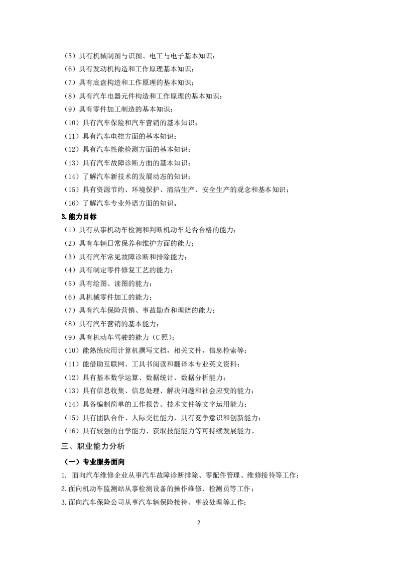 高等职业技术教育《汽车检测与维修技术》专业人才培养方案(普招三年制)专业代码:560702一、学制及招生对象(一)学制:三年。(二)招生对象:高中(中职)毕业生。(三)招生类型:理科。二、培养目标与人才规格(一)培养目标本专业培养德、智、体全面发展,具有较高综合素质、良好职业道德、创新精神和创业意识,掌握汽车性能检测、汽车故障诊断与排除、汽车营销、机械加工、汽车保险理赔等方面的知识,具备汽车安全环保和综合性能检测、汽车维修、汽车销售、机械零部件的加工工艺、汽车保险的受理和现场理赔的能力,在汽车制造厂、零配件制造企业、汽车检测站、汽车维修企业、汽车销售企业、4S店、保险公司等部门,从事汽车制造、机动车检测、汽车维修保养、保险理赔、汽车营销和技术咨询服务等第一线需要的高素质技术技能人才。(二)人才规格1.素质目标(1)思想政治素质:拥护党的基本路线,具有坚定正确的政治方向:掌握毛泽东思想和邓小平理论以及“三个代表”的重要思想和科学发展观:具有正确的世界观、人生观和价值观,具有良好的诚信品质、敬业精神、责任意识、团队意识和诚信意识,格守公民基本道德规范。(2)职业素质:具有良好的职业安全、环境保护意识、职业道德、创新精神、创业意识,能够立足生产、建设、管理、服务一线,踏实进取,敬业奉献,善于合作,敢于竞争,勇于创新。(3)人文科学素质:具有宽阔的视野、良好的科学思维品质、高雅的审美情趣和正确的审美观:能够正确认识社会、主动适应社会,有较强文字和语言表达能力,有较强的人际交往能力和自我发展能力。(4)身体心理素质:具有健康的身体,良好的生活习惯,爱好体育运动,有一定的运动基础。具有健康积极的人生态度,良好的个性心理品质,有较强的心理调适能力和抗挫折能力。2.知识目标(1)具有必须的公共英语听、说、读、写基本知识和职业英语知识:(2)具有必备的文化基础知识和人文社会科学知识:(3)具有计算机应用的基本知识:(4)具有必须的数学等基础知识: