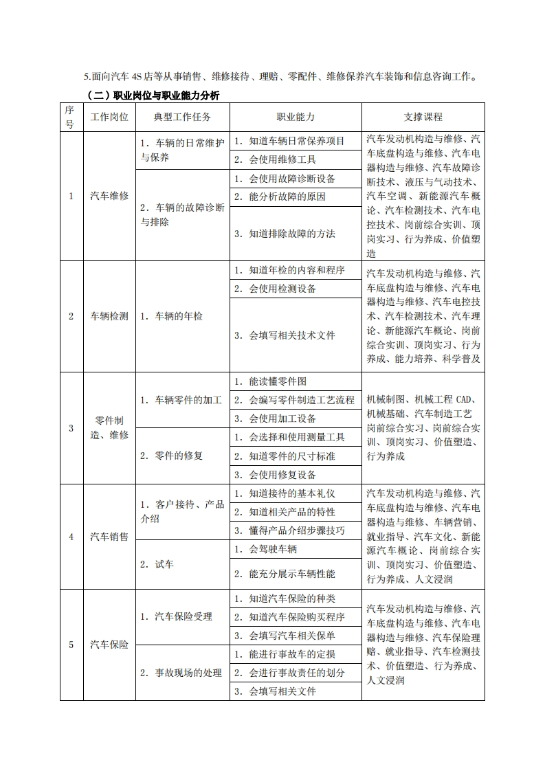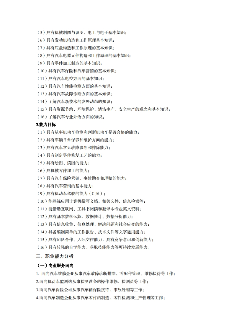 高等职业技术教育《汽车检测与维修技术》专业人才培养方案(普招三年制)专业代码:560702一、学制及招生对象(一)学制:三年。(二)招生对象:高中(中职)毕业生。(三)招生类型:理科。二、培养目标与人才规格(一)培养目标本专业培养德、智、体、美、劳全面发展,具有较高综合素质、良好职业道德、创新精神和创业意识,掌握汽车性能检测、汽车故障诊断与排除、汽车营销、机械加工、汽车保险理赔等方面的知识,具备汽车安全环保和综合性能检测、汽车维修、汽车销售、机械零部件的加工工艺、汽车保险的受理和现场理赔的能力,在汽车制造厂、零配件制造企业、汽车检测站、汽车维修企业、汽车销售企业、4S店、保险公司等部门,从事汽车制造、机动车检测、汽车维修保养、保险理赔、汽车营销和技术咨询服务等第一线需要的高素质技术技能人才。(二)人才规格1素质目标(1)思想政治素质:拥护党的基本路线,具有坚定正确的政治方向;掌握毛泽东思想和邓小平理论以及“三个代表”的重要思想和科学发展观;具有正确的世界观、人生观和价值观,具有良好的诚信品质、敬业精神、责任意识、团队意识和诚信意识,格守公民基本道德规范。(2)职业素质:具有良好的职业安全、环境保护意识、职业道德、创新精神、创业意识,能够立足生产、建设、管理、服务一线,踏实进取,敬业奉献,善于合作,敢于竞争,勇于创新。(3)人文科学素质:具有宽阔的视野、良好的科学思维品质、高雅的审美情趣和正确的审美观:能够正确认识社会、主动适应社会,有较强文字和语言表达能力,有较强的人际交往能力和自我发展能力。(4)身体心理素质:具有健康的身体,良好的生活习惯,爱好体育运动,有一定的运动基础。具有健康积极的人生态度,良好的个性心理品质,有较强的心理调适能力和抗挫折能力。2.知识目标(1)具有必须的公共英语听、说、读、写基本知识和职业英语知识:(2)具有必备的文化基础知识和人文社会科学知识:(3)具有计算机应用的基本知识:(4)具有必须的数学等基础知识: