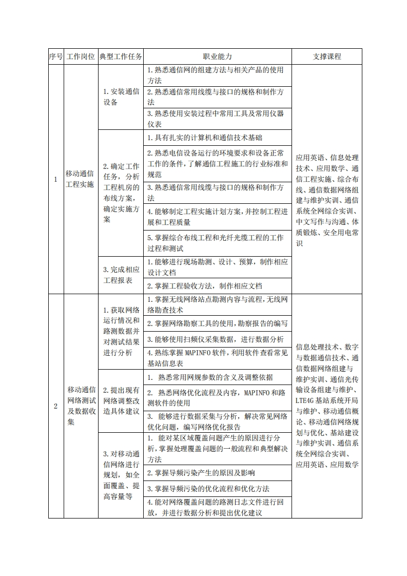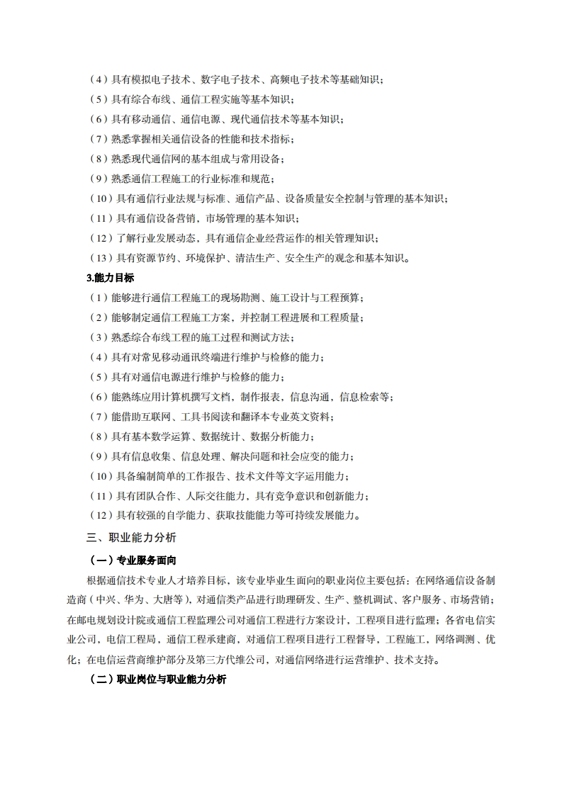 高等职业技术教育《通信技术》专业人才培养方案(普招三年制)专业代码:610301一、学制及招生对象(一)学制:三年。(二)招生对象:高中(中职)毕业生。(三)招生类型:文理兼收。二、培养目标与人才规格(一)培养目标本专业培养德、智、体、美、劳全面发展,具有较高综合素质、良好职业道德、创新精神和创业意识,掌握数字通信原理、移动通信技术、LE基站运行维护、数据网组建、通信网络优化的基本理论知识,具备移动通信系统及其设备运行、检测、维护、优化、移动终端设备检修及移动通信工程技术管理能力,在通信技术行业从事通信设备制造、通信设备组网、运行维护,通信工程实施工作的生产、建设、服务和管理第一线需要的技术技能人才。(二)人才规格1素质目标(1)思想政治素质:拥护党的基本路线,具有坚定正确的政治方向;掌握毛泽东思想和邓小平理论以及“三个代表”的重要思想和科学发展观:具有正确的世界观、人生观和价值观,具有良好的诚信品质、敬业精神、责任意识、团队意识和诚信意识,格守公民基本道德规范。(2)职业素质:具有良好的职业安全、环境保护意识、职业道德、创新精神、创业意识,能够立足生产、建设、管理、服务一线,踏实进取,敬业奉献,善于合作,敢于竞争,勇于创新。(3)人文科学素质:具有宽阔的视野、良好的科学思维品质、高雅的审美情趣和正确的审美观:能够正确认识社会、主动适应社会,有较强文字和语言表达能力,有较强的人际交往能力和自我发展能力。(4)身体心理素质:具有健康的身体,良好的生活习惯,爱好体育运动,有一定的运动基础。具有健康积极的人生态度,良好的个性心理品质,有较强的心理调适能力和抗挫折能力。2知识目标(1)具有必须的公共英语听、说、读、写基本知识和职业英语知识:(2)具有必备的文化基础知识和人文社会科学知识:(3)具有计算机应用的基本知识: