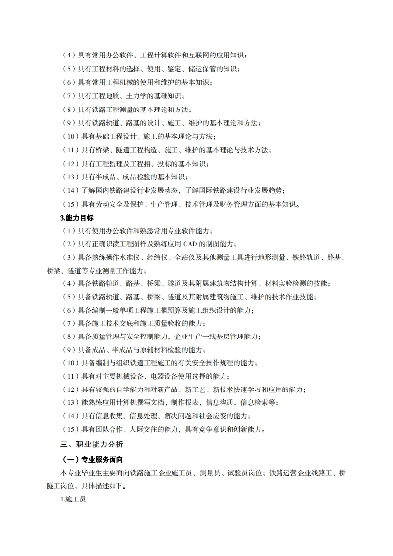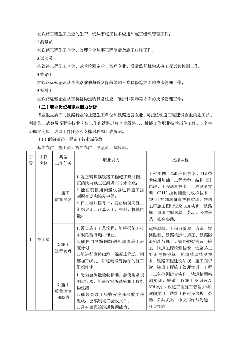高等职业技术教育《铁道工程技术》专业人才培养方案(普招三年制)专业代码:500101一、学制及招生对象(一)学制:三年。(二)招生对象:高中(中职)毕业生。(三)招生类型:理科。二、培养目标与人才规格(一)培养目标本专业培养德、智、体、美、劳全面发展,具有较高综合素质、良好职业道德、创新精神和创业意识,掌握铁道工程施工设计图纸识读和绘制、路线勘测与设计、铁路、桥涵、隧道等工程施工、质量、造价与安全管理等基本知识,具备施工图识读与绘制、施工测量放样、材料质量检验、施工组织与管理、质量检查与验收等能力,在铁路建设施工、管理一线从事铁道工程施工、工程测量、试验检测、质量检验、现场组织、合同管理等工作的高素质技术技能人才。(二)人才规格1.素质目标(1)思想政治素质:系统掌握马克思主义基本原理和马克思主义中国化理论成果,了解党史、新中国史、改革开放史、社会主义发展史,认识世情、国情、党情,深刻领会习近平新时代中国特色社会主义思想,培养运用马克思主义立场观点方法分析和解决问题的能力:自觉践行社会主义核心价值观,尊重和维护宪法法律权威,识大局、尊法治、修美德:矢志不渝听党话跟党走,争做社会主义合格建设者和可靠接班人。(2)职业素质:具有良好的职业安全、环境保护意识、职业道德、创新精神、创业意识,能够立足生产、建设、管理、服务一线,踏实进取,敬业奉献,善于合作,敢于竞争,勇于创新。(3)人文科学素质:具有宽阔的视野、良好的科学思维品质、高雅的审美情趣和正确的审美观:能够正确认识社会、主动适应社会,有较强文字和语言表达能力,有较强的人际交往能力和自我发展能力。(4)身体心理素质:具有健康的身体,良好的生活习惯,爱好体育运动,有一定的运动基础。具有健康积极的人生态度,良好的个性心理品质,有较强的心理调适能力和抗挫折能力。2.知识目标(1)具有必须的公共英语听、说、读、写基本知识和职业英语知识:(2)具有必备的文化基础知识和人文社会科学知识:(3)具有工程制图与识图、计算机辅助设计软件基本操作知识: