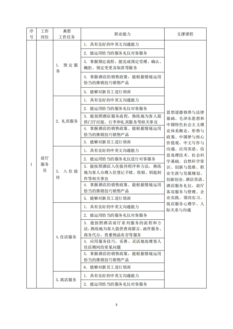 高等职业技术教育《酒店管理》专业人才培养方案((普招三年制)专业代码:640105一、学制及招生对象(一)学制:三年。(二)招生对象:高中(中职)毕业生。(三)招生类型:文理兼收。二、培养目标与人才规格(一)培养目标本专业培养德、智、体全面发展,具有较高综合素质、良好职业道德、创新精神和创业意识,掌握酒店前厅客房服务与管理、餐饮管理、营销策划、人力资源管理、酒店财务管理等基本知识:具备较强的沟通能力,分析及解决问题的能力,酒店一线服务及管理能力,能在高星级商务酒店、高级度假酒店、高档餐饮连锁集团公司、会议中心、豪华邮轮、高级会所、国际酒店管理公司等旅游企业及其他相近企业从事服务与管理工作一线需要的高素质技术技能人才。(二)人才规格1.素质目标(1)思想政治素质:拥护党的基本路线,具有坚定正确的政治方向:掌握毛泽东思想和邓小平理论以及“三个代表”的重要思想和科学发展观:具有正确的世界观、人生观和价值观,具有良好的诚信品质、敬业精神、责任意识、团队意识和诚信意识,格守公民基本道德规范。(2)职业素质:具有良好的职业安全、环境保护意识、职业道德,创新精神、创业意识,能够立足生产、建设、管理、服务一线,踏实进取,敬业奉献,善于合作,敢于竞争,勇于创新。(3)人文科学素质:具有宽阔的视野、良好的科学思维品质、高雅的审美情趣和正确的审美观:能够正确认识社会、主动适应社会,有较强文字和语言表达能力,有较强的人际交往能力和自我发展能力。(4)身体心理素质:具有健康的身体,良好的生活习惯,爱好体育运动,有一定的运动基础。具有健康积极的人生态度,良好的个性心理品质,有较强的心理调适能力和抗挫折能力。2.知识目标(1)具有必须的公共英语听、说、读、写基本知识和职业英语知识:(2)具有必备的文化基础知识和人文社会科学知识:(3)具有计算机应用的基本知识:(4)具有必须的管理学、经济学、公共关系等基础知识:(5)具有酒店服务礼仪、饭店业法规等基本知识:1