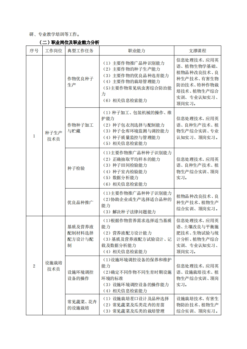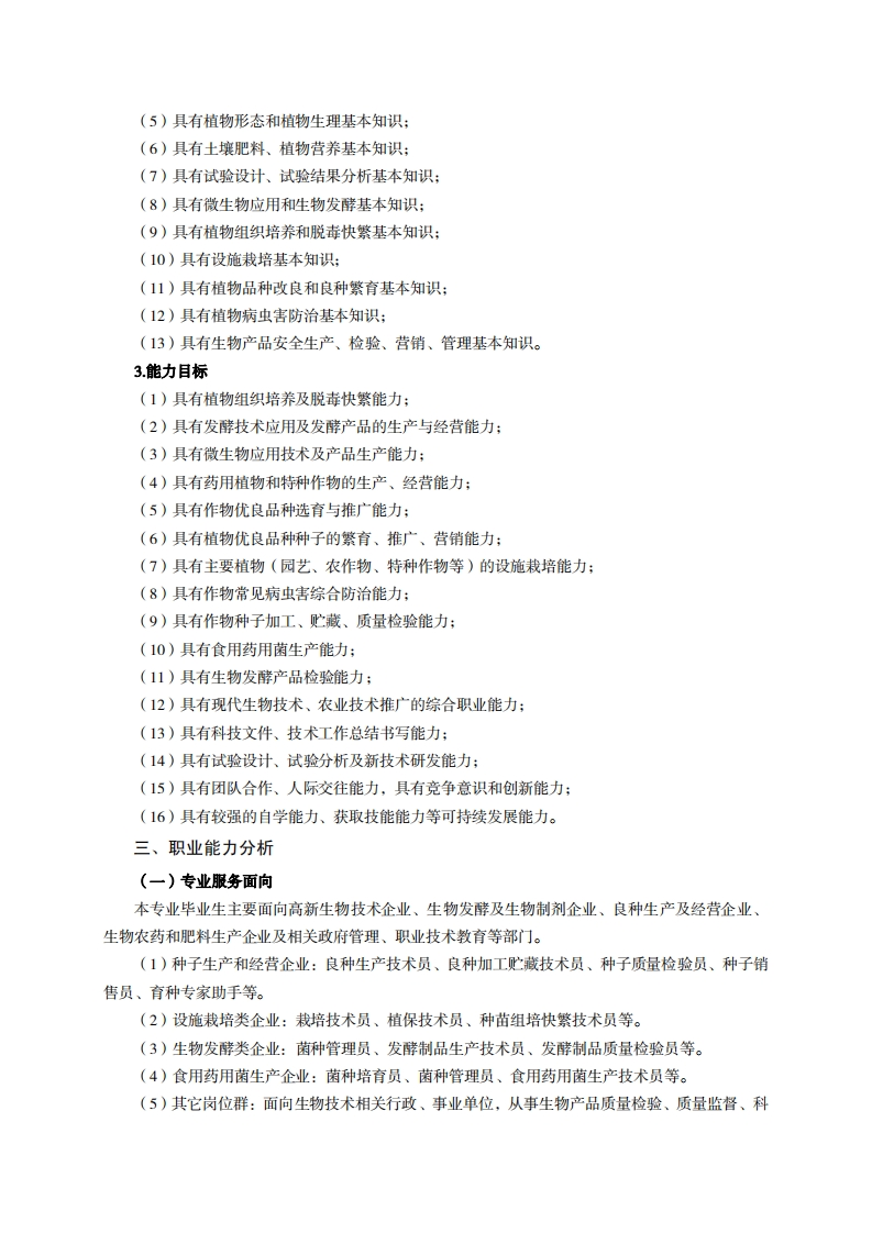 高等职业教育《农业生物技术》专业人才培养方案(普招三年制)专业代码:470103一、学制及招生对象(一)学制:三年。(二)招生对象:高中(中职)毕业生。(三)招生类型:文理兼收。二、培养目标与人才规格(一)培养目标本专业培养德智体美劳全面发展,具有较高综合素质、良好职业道德、创新精神和创业意识,掌握良种生产、设施栽培、生物发酵和微生物应用等方面的基础理论和专业知识,具备植物组培快繁、生物肥料农药生产及应用、生物发酵制品生产、食用药用菌生产等专业能力,在种子生产和经营企业、设施栽培类企业、生物发酵类企业、食用药用菌生产企业从事产品的生产、检验、管理、销售、协助研发等工作的第一线需要的技术技能人才。(二)人才规格1.素质目标(1)思想政治素质:系统掌握马克思主义基本原理和马克思主义中国化理论成果,了解党史、新中国史、改革开放史、社会主义发展史,认识世情、国情、党情,深刻领会习近平新时代中国特色社会主义思想,培养运用马克思主义立场观点方法分析和解决问题的能力;自觉践行社会主义核心价值观,尊重和维护宪法法律权威,识大局、尊法治、修美德;矢志不渝听党话跟党走,争做社会主义合格建设者和可靠接班人。(2)职业素质:具有良好的职业安全、环境保护意识、职业道德、创新精神、创业意识,能够立足生产、建设、管理、服务一线,踏实进取,敬业奉献,善于合作,敢于竞争,勇于创新。(3)人文科学素质:具有宽阔的视野、良好的科学思维品质、高雅的审美情趣和正确的审美观;能够正确认识社会、主动适应社会,有较强文字和语言表达能力,有较强的人际交往能力和自我发展能力。(4)身体心理素质:具有健康的身体,良好的生活习惯,爱好体育运动,有一定的运动基础。具有健康积极的人生态度,良好的个性心理品质,有较强的心理调适能力和抗挫折能力。2.知识目标(1)具有必须的公共英语听、说、读、写基本知识和职业英语知识:(2)具有必备的文化基础知识和人文社会科学知识:(3)具有计算机应用基本知识:(4)具有必须的化学、生物化学、微生物等基础知识: