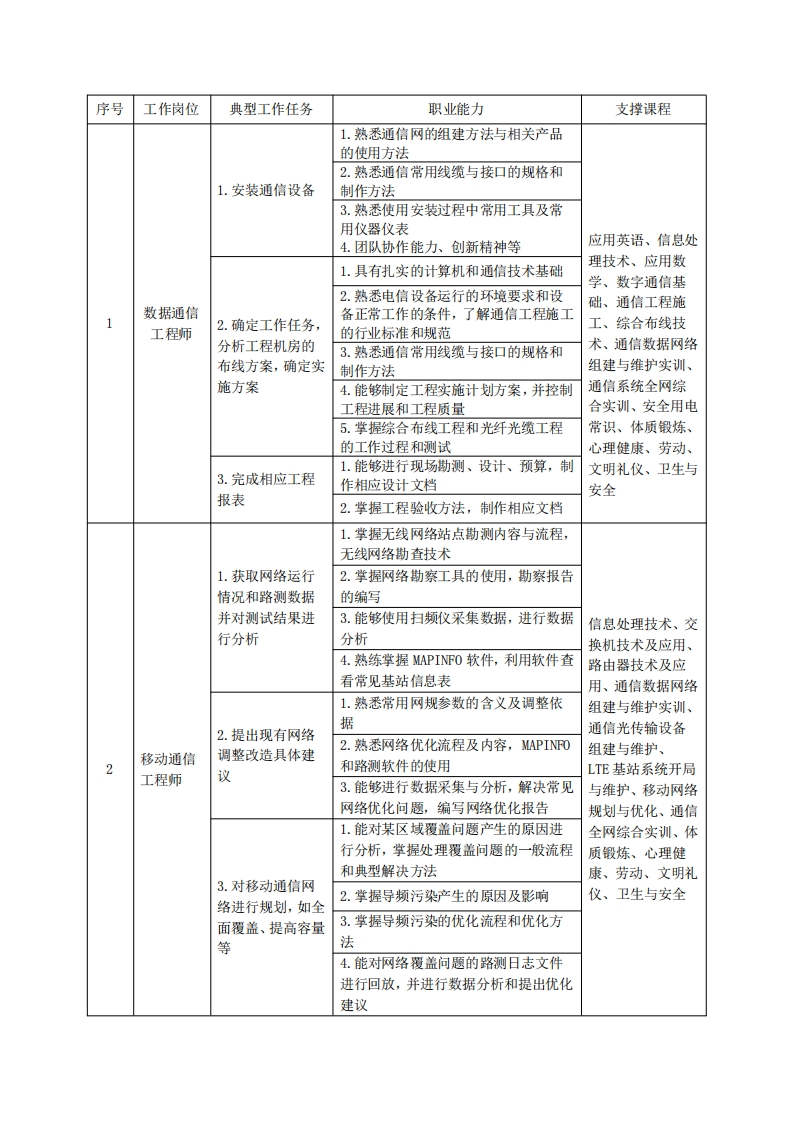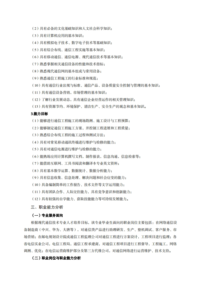 高等职业教育《现代通信技术》专业人才培养方案(普招三年制)专业代码:510301一、学制及招生对象(一)学制:三年。(二)招生对象:高中(中职)毕业生。(三)招生类型:文理兼收。二、培养目标与人才规格(一)培养目标本专业培养德智体美劳全面发展,具有较高综合索质、良好职业道德、创新精神和创业意识,掌握数字通信原理、移动通信技术、4G/5G基站运行维护、数据网组建、通信网络优化的基本理论知识,具备移动通信系统及其设备运行、检测、维护、优化、移动终端设备检修及移动通信工程技术管理能力,在通信技术行业从事通信设备制造、通信软硬件测试、通信终端制造、通信设备组网、运行维护,通信工程实施工作的生产、建设、服务和管理第一线需要的高素质技术技能人才。(二)人才规格1.素质目标(1)思想政治素质:系统掌握马克思主义基本原理和马克思主义中国化理论成果,了解党史、新中国史、改革开放史、社会主义发展史,认识世情、国情、党情,深刻领会习近平新时代中国特色社会主义思想,培养运用马克思主义立场观点方法分析和解决问题的能力;自觉践行社会主义核心价值观,尊重和维护宪法法律权威,识大局、尊法治、修美德;矢志不渝听党话跟党走,争做社会主义合格建设者和可靠接班人。(2)职业素质:具有良好的职业安全、环境保护意识、职业道德、创新精神、创业意识,能够立足生产、建设、管理、服务一线,踏实进取,敬业奉献,善于合作,敢于竞争,勇于创新。(3)人文科学素质:具有宽阔的视野、良好的科学思维品质、高雅的审美情趣和正确的审美观:能够正确认识社会、主动适应社会,有较强文字和语言表达能力,有较强的人际交往能力和自我发展能力。(4)身体心理素质:具有健康的身体,良好的生活习惯,爱好体育运动,有一定的运动基础。具有健康积极的人生态度,良好的个性心理品质,有较强的心理调适能力和抗挫折能力。2.知识目标(1)具有必须的公共英语听、说、读、写基本知识和职业英语知识;
