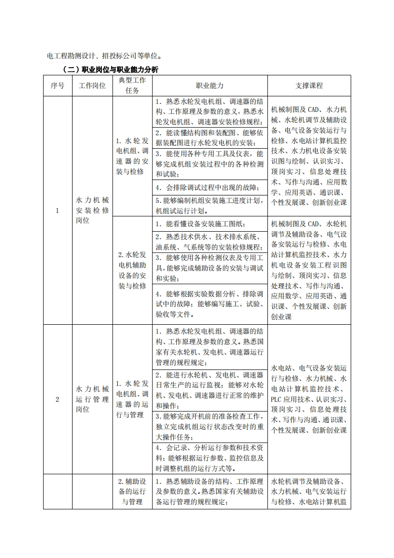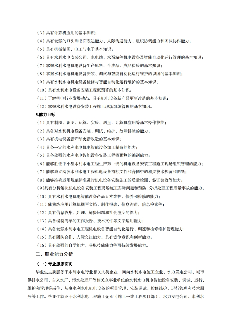 高等职业教育《水利机电设备智能管理》专业人才培养方案(普招三年制)专业代码:450303一、学制及招生对象(一)学制:三年。(二)招生对象:高中(中职)毕业生。(三)招生类型:理科。二、培养目标与人才规格(一)培养目标本专业培养德智体美劳全面发展,具有较高综合素质、良好职业道德、创新精神和创业意识,掌握水利水电工程机电设备的安装检修、调试维护、运行管理和技术服务的理论知识,具备水利水电机电设备的安装、检修、操作、维护和管理等能力,在水利水电施工企业、工程咨询公司、水电(泵)站、城市供排水、污水处理等企业从事机电设备智能自动化技术服务工作的建设、管理、生产和服务第一线需要的高素质技术技能人才。(二)人才规格1.素质目标(1)思想政治素质:系统掌握马克思主义基本原理和马克思主义中国化理论成果,了解党史、新中国史、改革开放史、社会主义发展史,认识世情、国情、党情,深刻领会习近平新时代中国特色社会主义思想,培养运用马克思主义立场观点方法分析和解决问题的能力;自觉践行社会主义核心价值观,尊重和维护宪法法律权威,识大局、尊法治、修美德;矢志不渝听党话跟党走,争做社会主义合格建设者和可靠接班人。(2)职业素质:具有良好的职业安全、环境保护意识、职业道德、创新精神、创业意识,能够立足生产、建设、管理、服务一线,踏实进取,敬业奉献,善于合作,敢于竞争,勇于创新。(3)人文科学素质:具有宽阔的视野、良好的科学思维品质、高雅的审美情趣和正确的审美观:能够正确认识社会、主动适应社会,有较强文字和语言表达能力,有较强的人际交往能力和自我发展能力。(4)身体心理素质:具有健康的身体,良好的生活习惯,爱好体育运动,有一定的运动基础。具有健康积极的人生态度,良好的个性心理品质,有较强的心理调适能力和抗挫折能力。2.知识目标(1)具有必须的公共英语听、说、读、写基本知识和职业英语知识;(2)具有必备的文化基础知识和人文社会科学知识: