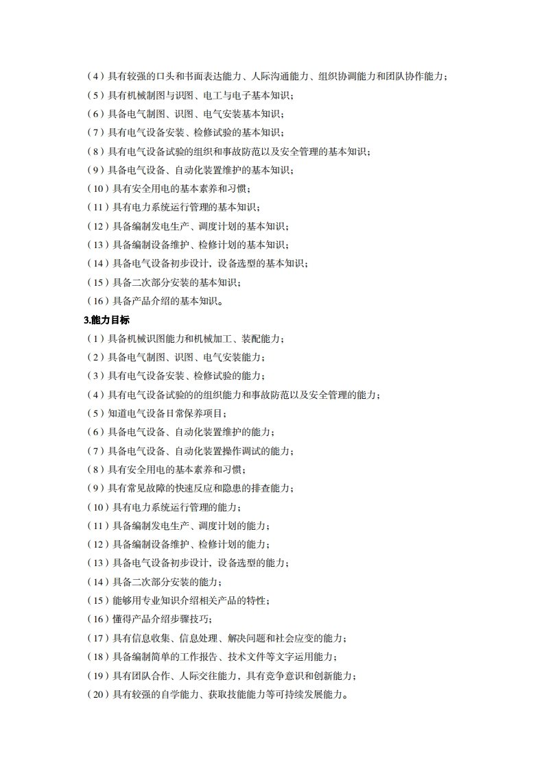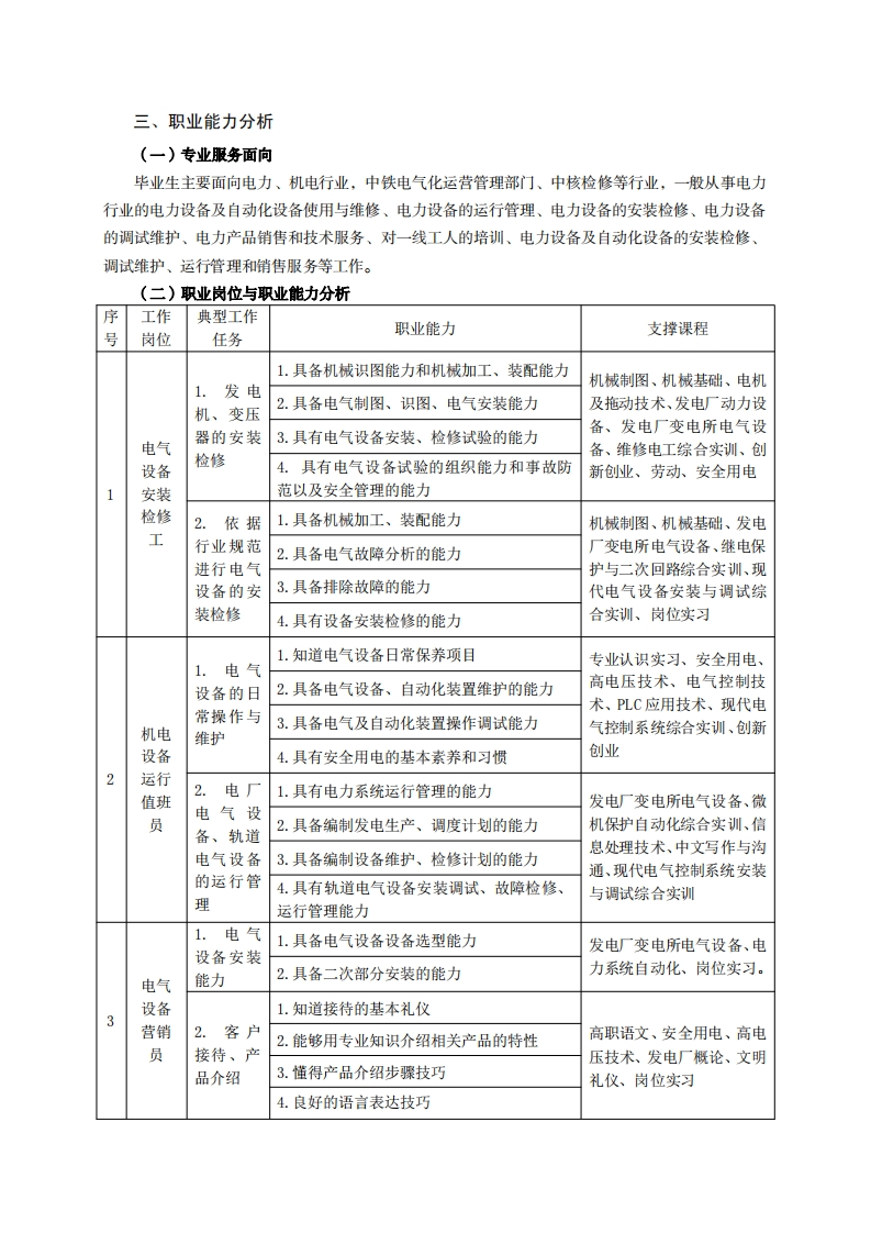 高等职业教育《电力系统自动化技术》专业人才培养方案(普招三年制)专业代码:430105一、学制及招生对象(一)学制:三年。(二)招生对象:高中(中职)毕业生。(三)招生类型:理科。二、培养目标与人才规格(一)培养目标本专业培养德智体美劳全面发展,具有较高综合素质、良好职业道德、创新精神和创业意识,掌握电力设备的运行管理、安装检修、调试维护、产品销售和技术服务的知识,具备电气安装、检修试验、电气故障分析、自动化装置维护及其操作调试的能力,在发电厂、电力公司、电力建筑企业、电力机械制造企业、铁道电气等行业从事电力及自动化设备工作的生产、建设、服务和管理第一线需要的高素质技术技能人才。(二)人才规格1.素质目标(1)思想政治素质:系统掌握马克思主义基本原理和马克思主义中国化理论成果,了解党史、新中国史、改革开放史、社会主义发展史,认识世情、国情、党情,深刻领会习近平新时代中国特色社会主义思想,培养运用马克思主义立场观点方法分析和解决问题的能力:自觉践行社会主义核心价值观,尊重和维护宪法法律权威,识大局、尊法治、修美德:矢志不渝听党话跟党走,争做社会主义合格建设者和可靠接班人。(2)职业素质:具有良好的职业安全、环境保护意识、职业道德、创业精神、创业意识,能够立足生产、建设、管理、服务一线,踏实进取,敬业奉献,善于合作,敢于竞争,勇于创新。(3)人文科学素质:具有宽阔的视野、良好的科学思维品质、高雅的审美情趣和正确的审美观:能够正确认识社会、主动适应社会,有较强文字和语言表达能力,有较强的人际交往能力和自我发展能力。(4)身体心理素质:具有健康的身体,良好的生活习惯,爱好体育运动,有一定的运动基础。具有健康积极的人生态度,良好的个性心理品质,有较强的心理调适能力和抗挫折能力。2知识目标(1)具有必须的公共英语听、说、读、写基本知识和职业英语知识:(2)具有必备的文化基础知识和人文社会科学知识:(3)具有计算机应用的基本知识: