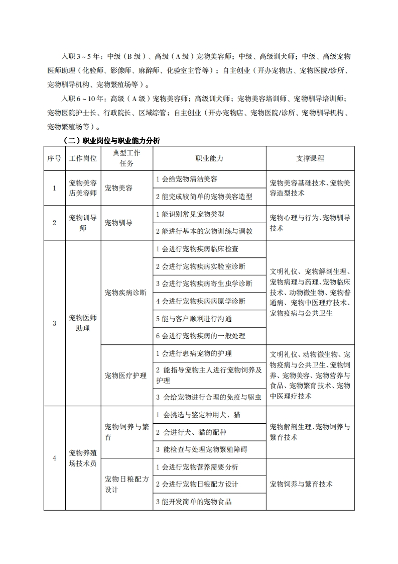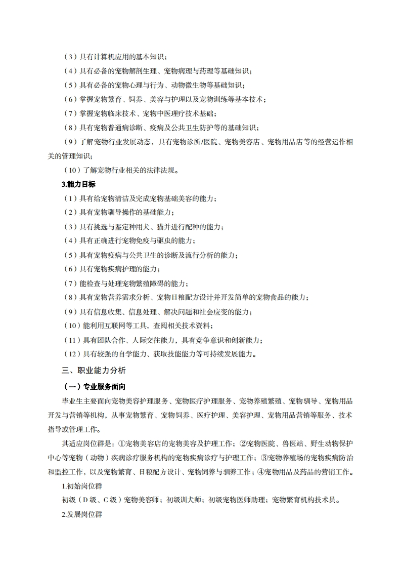 高等职业教育《宠物养护与驯导》专业现代学徒制人才培养方案(普招三年制)专业代码:410309一、学制及招生对象(一)学制:三年。(二)招生对象:高中(中职)毕业生。(三)招生类型:文理兼收。二、培养目标与人才规格(一)培养目标本专业培养德智体美劳全面发展,具有较高综合素质、良好职业道德、创新精神和创业意识,掌握宠物饲养管理、宠物驯导、宠物美容与保健、宠物疾病护理等知识,具备宠物美容、繁殖和饲养、宠物驯导、宠物护理与保健等能力,适应宠物行业发展需求,能在宠物美容机构、宠物医院、宠物繁殖场、宠物用品与药品经营等企业从事宠物繁育与饲养、宠物美容、宠物驯导、宠物护理与保健、宠物用品与药品营销、管理等工作的高素质技术技能人才。(二)人才规格1.素质目标(1)思想政治素质:系统掌握马克思主义基本原理和马克思主义中国化理论成果,了解党史、新中国史、改革开放史、社会主义发展史,认识世情、国情、党情,深刻领会习近平新时代中国特色社会主义思想,培养运用马克思主义立场观点方法分析和解决问题的能力;自觉践行社会主义核心价值观,尊重和维护宪法法律权威,识大局、尊法治、修美德:矢志不渝听党话跟党走,争做社会主义合格建设者和可靠接班人。(2)职业素质:具有良好的职业安全、环境保护意识、职业道德、创新精神、创业意识,能够立足生产、建设、管理、服务一线,踏实进取,敬业奉献,善于合作,敢于竞争,勇于创新。(3)人文科学素质:具有宽阔的视野、良好的科学思维品质、高雅的审美情趣和正确的审美观;能够正确认识社会、主动适应社会,有较强文字和语言表达能力,有较强的人际交往能力和自我发展能力。(4)身体心理素质:具有健康的身体,良好的生活习惯,爱好体育运动,有一定的运动基础。具有健康积极的人生态度,良好的个性心理品质,有较强的心理调适能力和抗挫折能力。2.知识目标(1)具有必需的公共英语听、说、读、写基本知识和职业英语知识:(2)具有必备的文化基础知识和人文社会科学知识: