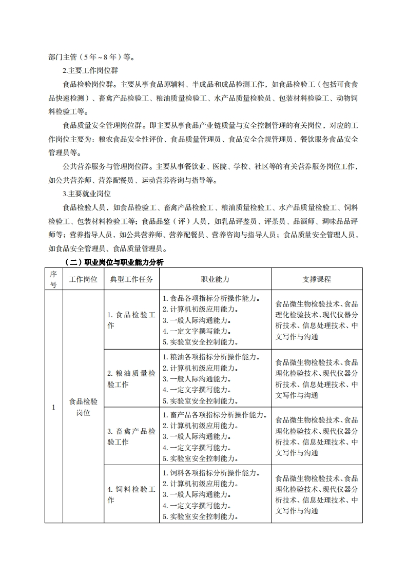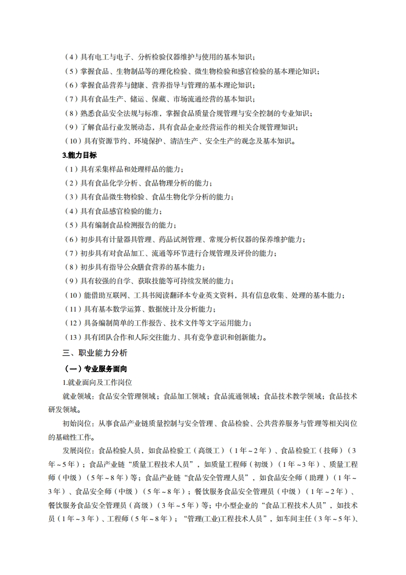 高等职业教育《食品检验检测技术》专业人才培养方案(普招三年制)专业代码:490104一、学制及招生对象(一)学制:三年。(二)招生对象:高中(中职)毕业生。(三)招生类型:理科。二、培养目标与人才规格(一)培养目标本专业培养德智体美劳全面发展,具有较高综合素质、良好职业道德、创新精神和创业意识,掌握食品检验检测、食品质量安全控制、食品营养与卫生、食品加工工艺的基本知识,具备食品检测、食品分析、食品安全控制、食品营养指导、食品运销等能力,在食品生产、流通、销售、检验等行业从事食品加工、食品检验、质量安全管理、营养指导与管理等方面工作的生产、建设、服务和管理第一线需要的高素质技术技能人才。(二)人才规格1.素质目标(1)思想政治素质:系统掌握马克思主义基本原理和马克思主义中国化理论成果,了解党史、新中国史、改革开放史、社会主义发展史,认识世情、国情、党情,深刻领会习近平新时代中国特色社会主义思想,培养运用马克思主义立场观点方法分析和解决问题的能力:自觉践行社会主义核心价值观,尊重和维护宪法法律权威,识大局、尊法治、修美德:矢志不渝听党话跟党走,争做社会主义合格建设者和可靠接班人。(2)职业素质:具有良好的职业安全、环境保护意识、职业道德、创新精神、创业意识,能够立足生产、建设、管理、服务一线,踏实进取,敬业奉献,善于合作,敢于竞争,勇于创新。(3)人文科学素质:具有宽阔的视野、良好的科学思维品质、高雅的审美情趣和正确的审美观;能够正确认识社会、主动适应社会,有较强文字和语言表达能力,有较强的人际交往能力和自我发展能力。(4)身体心理素质:具有健康的身体,良好的生活习惯,爱好体育运动,有一定的运动基础。具有健康积极的人生态度,良好的个性心理品质,有较强的心理调适能力和抗挫折能力。2.知识目标(1)具有本专业所必需的公共英语和职业英语知识;(2)具有必备的政治理论、计算机应用、数理基础,以及社会与人文知识:(3)具有有机化学、分析化学、食品生物化学等各类化学知识: