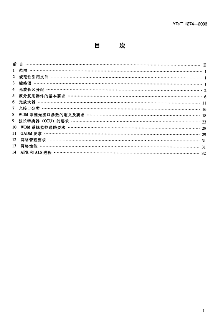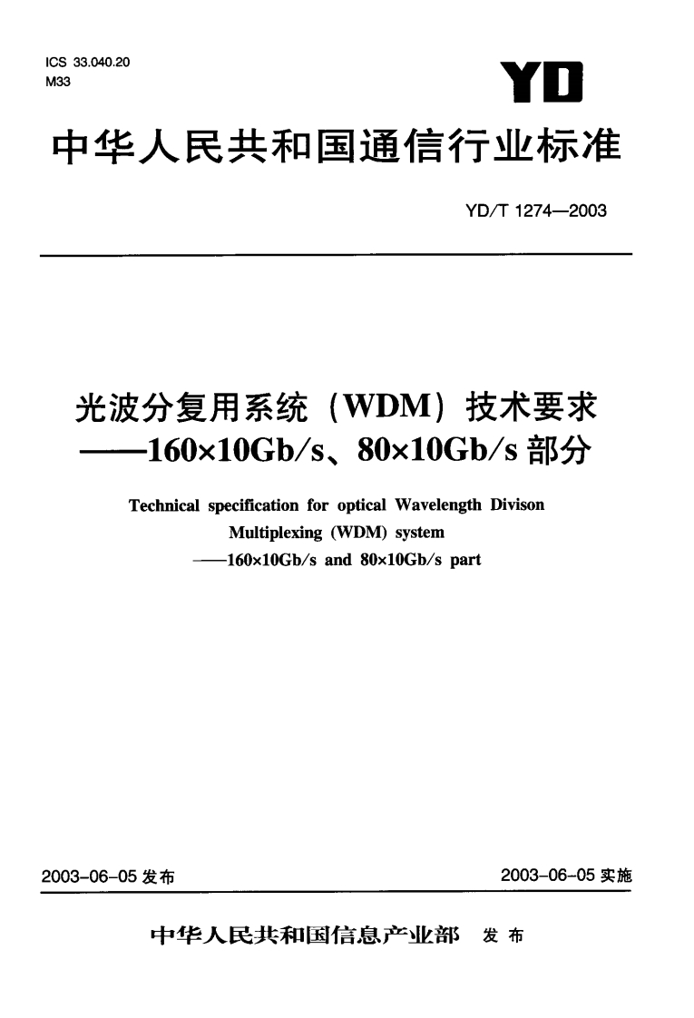 1CS33.040.20M33YD中华人民共和国通信行业标准YD/T1274-2003光波分复用系统(WDM)技术要求一160x10Gb/s、80x10Gb/s部分Technical specification for optical Wavelength DivisonMultiplexing (WDM)system-160x10Gb/s and 80x10Gb/s part2003-06-05发布2003-06-05实施中华人民共和国信息产业部发布