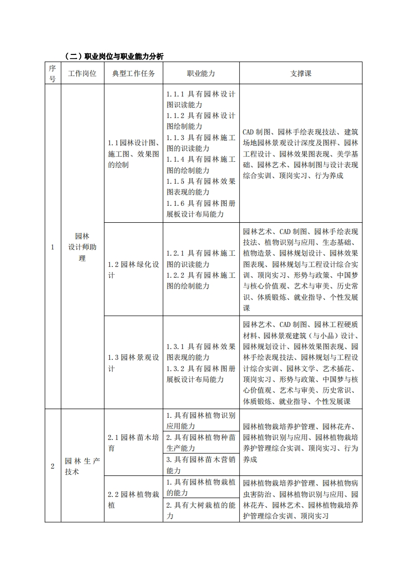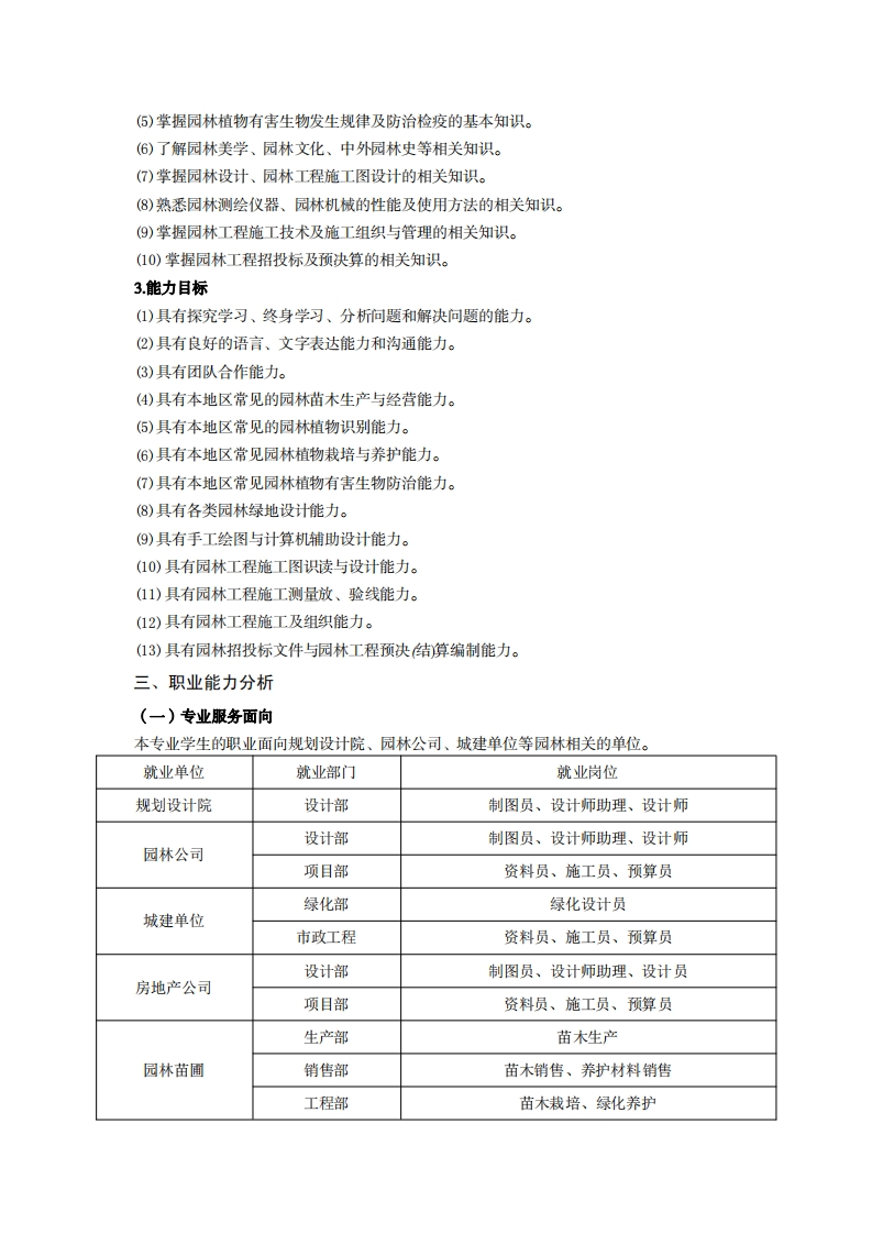 高等职业教育《园林技术》专业人才培养方案(普招三年制)专业代码:410202一、学制及招生对象(一)学制:三年。(二)招生对象:高中(中职)毕业生。(三)招生类型:文理兼收。二、培养目标与人才规格(一)培养目标本专业培养能够践行社会主义核心价值观,德智体美劳全面发展,具有一定的科学文化水平,良好的人文素养、职业道德和创新意识,精益求精的工匠精神,较强的就业创业能力和可持续发展的能力,掌握本专业知识和技术技能,面向其他林业专业及辅助性活动、绿化管理、城市公园管理行业的园林绿化工程技术人员、园林植物保护工程技术人员的职业群,能够从事园林植物生产与养护、园林景观设计、园林工程施工与管理工作的高素质技术技能人才。(二)人才规格1.素质目标()思想政治素质:系统掌握马克思主义基本原理和马克思主义中国化理论成果,了解党史、新中国史、改革开放史、社会主义发展史,认识世情、国情、党情,深刻领会习近平新时代中国特色社会主义思想,培养运用马克思主义立场观点方法分析和解决问题的能力;自觉践行社会主义核心价值观,尊重和维护宪法法律权威,识大局、尊法治、修美德;矢志不渝听党话跟党走,争做社会主义合格建设者和可靠接班人。(2)职业素质:具有良好的职业安全、环境保护意识、职业道德、创新精神、创业意识,能够立足生产、建设、管理、服务一线,踏实进取,敬业奉献,善于合作,敢于竞争,勇于创新。(3)人文科学索质:具有宽阔的视野、良好的科学思维品质、高雅的审美情趣和正确的审美观:能够正确认识社会、主动适应社会,有较强文字和语言表达能力,有较强的人际交往能力和自我发展能力。(4)身体心理索质:具有健康身体,良好生活习惯,爱好体育运动,有一定运动基础。具有健康积极的人生态度,良好个性心理品质,有较强的心理调适能力和抗挫折能力。2.知识目标(1)掌握必备的思想政治理论、科学文化基础知识和中华优秀传统文化知识。(2)熟悉与本专业相关的法律法规以及环境保护、安全消防等知识。(3)掌握园林植物生物学特性和生态学习性、园林植物生长环境(仕壤、肥料、气候等)等知识。(4)掌握园林植物繁育、栽培、养护的基本知识。
