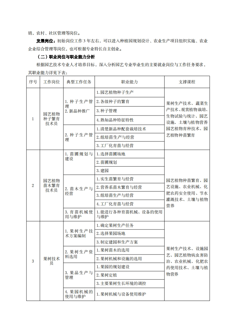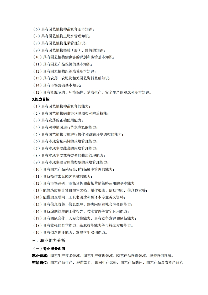 高等职业教育《园艺技术》专业人才培养方案(普招三年制)专业代码:410105一、学制及招生对象(一)学制:三年。(二)招生对象:高中(中职)毕业生。(三)招生类型:文理兼收二、培养目标与人才规格(一)培养目标本专业培养德智体美劳全面发展,具有较高综合素质、良好职业道德、创新精神和创业意识,掌握果树、蔬菜、花卉生产及农业生产资料使用、农业机械设备操作、农场经营管理等基本知识,具备从事果树、蔬菜、花卉生产管理及营销能力,在园艺生产相关企业和家庭园艺场从事生产、建设、服务和管理第一线需要的高素质技术技能人才。(二)人才规格1.素质目标(1)思想政治素质:系统掌握马克思主义基本原理和马克思主义中国化理论成果,了解党史新中国史、改革开放史、社会主义发展史,认识世情、国情、党情,深刻领会习近平新时代中国特色社会主义思想,培养运用马克思主义立场观点方法分析和解决问题的能力;自觉践行社会主义核心价值观,尊重和维护宪法法律权威,识大局、尊法治、修美德;矢志不渝听党话跟党走,争做社会主义合格建设者和可靠接班人。(2)职业素质:具有良好的职业安全、环境保护意识、职业道德、创新精神、创业意识,能够立足生产、建设、管理、服务一线,踏实进取,敬业奉献,善于合作,敢于竞争,勇于创新。(3)人文科学素质:具有宽阔的视野、良好的科学思维品质、高雅的审美情趣和正确的审美观:能够正确认识社会、主动适应社会,有较强文字和语言表达能力,有较强的人际交往能力和自我发展能力。(4)身体心理素质:具有健康的身体,良好的生活习惯,爱好体育运动,有一定的运动基础。具有健康积极的人生态度,良好的个性心理品质,有较强的心理调适能力和抗挫折能力。2.知识目标(1)具有必备的文化基础知识和人文社会科学知识:(2)具有计算机应用的基本知识:(4)具有植物学、植物生理学、微生物学等基础知识:(5)具有园艺农资正确使用基本知识: