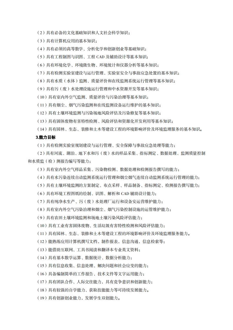 高等职业教育《环境监测技术》专业人才培养方案(普招三年制)专业代码:420801一、学制及招生对象(一)学制:三年。(二)招生对象:高中(中职)毕业生。(三)招生类型:文理兼收。二、培养目标与人才规格(一)培养目标本专业培养德智体美劳全面发展,具有较高综合素质、良好职业道德、创新精神和创业意识,掌握空气、水体、土壤、生物等环境的监测、评价及污染风险评估等方面基本知识,具备环境监测与评价、污染源在线监测系统与环保设施运行管理、污染风险评估与环境监理、实验室建设与日常管理等能力,在环保、水利、市政、国土、城建、化工、医药和农林等行业的行政管理部门或企业,从事第三方检测服务、污(废)水监测与净化设施运行管理、室内外空气检测与治理、土壤污染检测与风险评估、生物监测与生态风险评估、环境监理与建设工程环境影响评价等工作的生产、建设、服务和管理第一线需要的高素质技术技能人才。(二)人才规格1.素质目标(1)思想政治素质:系统掌握马克思主义基本原理和马克思主义中国化理论成果,了解党史、新中国史、改革开放史、社会主义发展史,认识世情、国情、党情,深刻领会习近平新时代中国特色社会主义思想,培养运用马克思主义立场观点方法分析和解决问题的能力:自觉践行社会主义核心价值观,尊重和维护宪法法律权威,识大局、尊法治、修美德;矢志不渝听党话跟党走,争做社会主义合格建设者和可靠接班人。(2)职业素质:具有良好的职业安全、环境保护意识、职业道德、创新精神、创业意识,能够立足生产、建设、管理、服务一线,踏实进取,敬业奉献,善于合作,敢于竞争,勇于创新。(3)人文科学素质:具有宽阔的视野、良好的科学思维品质、高雅的审美情趣和正确的审美观:能够正确认识社会、主动适应社会,有较强文字和语言表达能力,有较强的人际交往能力和自我发展能力。(4)身体心理素质:具有健康身体,良好生活习惯,爱好体育运动,有一定运动基础。具有健康积极的人生态度,良好个性心理品质,有较强的心理调适能力和抗挫折能力。2.知识目标(1)具有必须的公共英语听、说、读、写基本知识和职业英语知识: