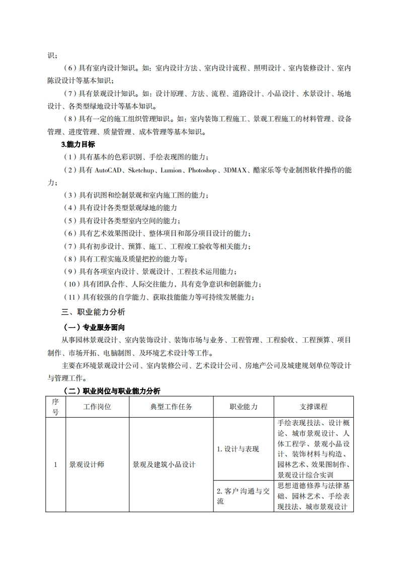 高等职业教育《环境艺术设计》专业人才培养方案(普招三年制)专业代码:550106一、学制及招生对象(一)学制:三年。(二)招生对象:高中(中职)毕业生。(三)招生类型:文理兼收。二、培养目标与人才规格(一)培养目标本专业培养德智体美劳全面发展,具有较高综合素质、良好职业道德、创新精神和创业意识,掌握景观设计知识与建筑室内设计知识,具备景观设计和室内设计与施工组织管理能力,在景观行业和室内设计行业从事设计、施工及组织管理工作的第一线需要的高素质技术技能人才。(二)人才规格1.素质目标(1)思想政治素质:系统掌握马克思主义基本原理和马克思主义中国化理论成果,了解党史、新中国史、改革开放史、社会主义发展史,认识世情、国情、党情,深刻领会习近平新时代中国特色社会主义思想,培养运用马克思主义立场观点方法分析和解决问题的能力;自觉践行社会主义核心价值观,尊重和维护宪法法律权威,识大局、尊法治、修美德;矢志不渝听党话跟党走,争做社会主义合格建设者和可靠接班人。(2)职业素质:具有良好的职业安全、环境保护意识、职业道德、创新精神、创业意识,能够立足生产、建设、管理、服务一线,踏实进取,敬业奉献,善于合作,敢于竞争,勇于创新。(3)人文科学素质:具有宽阔的视野、良好的科学思维品质、高雅的审美情趣和正确的审美观:能够正确认识社会、主动适应社会,有较强文字和语言表达能力,有较强的人际交往能力和自我发展能力。(4)身体心理素质:具有健康的身体,良好的生活习惯,爱好体育运动,有一定的运动基础。具有健康积极的人生态度,良好的个性心理品质,有较强的心理调适能力和抗挫折能力。2.知识目标(1)具有必须的公共英语听、说、读、写基本知识和职业英语知识:(2)具有必备的文化基础知识和人文社会科学知识:(3)具有专业基础知识。如:设计素描、设计概论、设计构成的基本知识:(4)具有专业技术知识。如:工程制图、AutoCAD制图、3Dmar制图、SU/图像图像处理、手绘表现技法的基本知识:(5)具有专业工艺知识。如:施工技术、组织与管理、工程概预算、装饰材料与构造的基本知