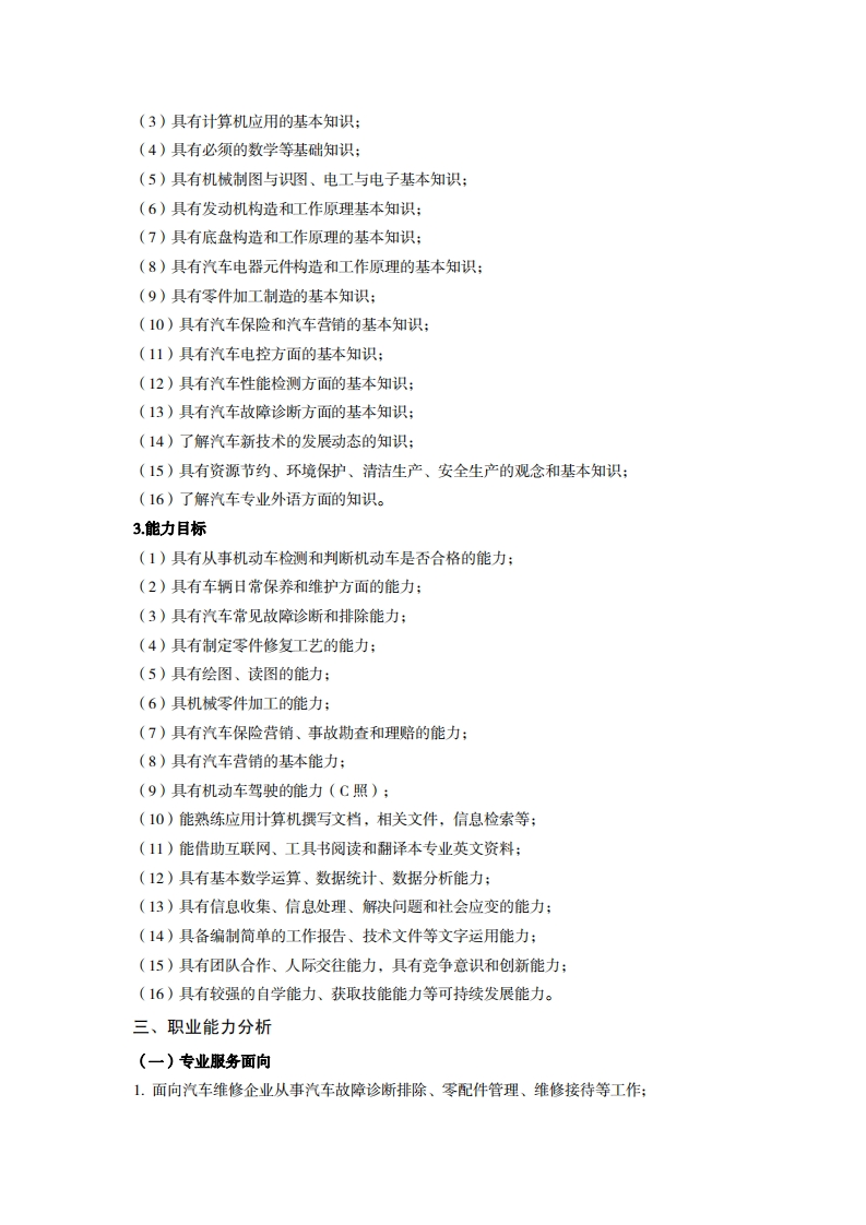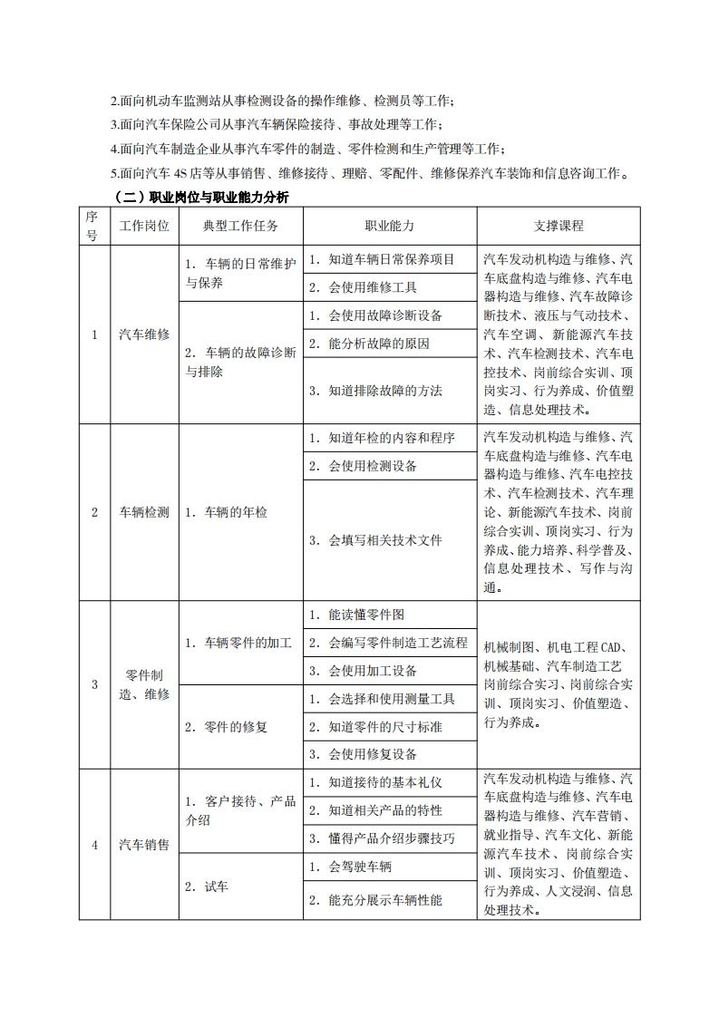 高等职业教育《汽车制造与试验技术》专业人才培养方案(普招三年制)专业代码:460701一、学制及招生对象(一)学制:三年。(二)招生对象:高中(中职)毕业生。(三)招生类型:文理兼收。二、培养目标与人才规格(一)培养目标本专业培养德智体美劳全面发展,具有较高综合素质、良好职业道德、创新精神和创业意识,掌握汽车性能检测、汽车故障诊断与排除、汽车营销、机械加工、汽车保险理赔等方面的知识,具备汽车安全环保和综合性能检测、汽车维修、汽车销售、机械零部件的加工工艺、汽车保险的受理和现场理赔的能力,在汽车制造厂、零配件制造企业、汽车检测站、汽车维修企业、汽车销售企业、4S店、保险公司等部门,从事汽车制造、机动车检测、汽车维修保养、保险理赔、汽车营销和技术咨询服务等第一线需要的高素质技术技能人才。(二)人才规格1.素质目标(1)思想政治素质:系统掌握马克思主义基本原理和马克思主义中国化理论成果,了解党史、新中国史、改革开放史、社会主义发展史,认识世情、国情、党情,深刻领会习近平新时代中国特色社会主义思想,培养运用马克思主义立场观点方法分析和解决问题的能力;自觉践行社会主义核心价值观,尊重和维护宪法法律权威,识大局、尊法治、修美德:矢志不渝听党话跟党走,争做社会主义合格建设者和可靠接班人。(2)职业素质:具有良好的职业安全、环境保护意识、职业道德、创新精神、创业意识,能够立足生产、建设、管理、服务一线,踏实进取,敬业奉献,善于合作,敢于竞争,勇于创新。(3)人文科学素质:具有宽阔的视野、良好的科学思维品质、高雅的审美情趣和正确的审美观;能够正确认识社会、主动适应社会,有较强文字和语言表达能力,有较强的人际交往能力和自我发展能力。(4)身体心理素质:具有健康的身体,良好的生活习惯,爱好体育运动,有一定的运动基础。具有健康积极的人生态度,良好的个性心理品质,有较强的心理调适能力和抗挫折能力。2.知识目标(1)具有必须的公共英语听、说、读、写基本知识和职业英语知识;(2)具有必备的文化基础知识和人文社会科学知识:
