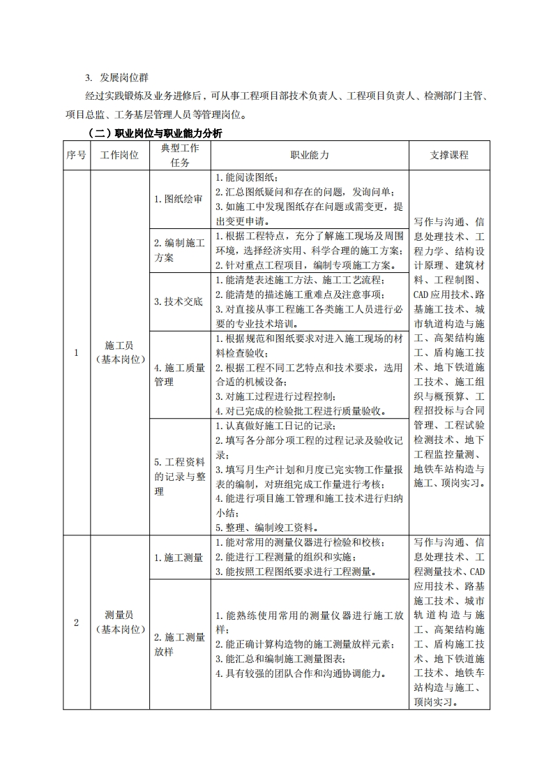 高等职业教育《城市轨道交通工程技术》专业人才培养方案(普招三年制)专业代码:500601一、学制及招生对象(一)学制:三年。(二)招生对象:高中(中职)毕业生。(三)招生类型:文理兼收。二、培养目标与人才规格(一)培养目标本专业培养德智体美劳全面发展,具有较高综合素质、良好职业道德、创新精神和创业意识,掌握城市轨道工程构造、基本施工方法、线路维修和工程管理等专业知识,具备城市轨道交通土建工程施工技术、检测技术、项目管理、监理与线路养护维修技能,在城市轨道行业从事土建工程的生产、建设、服务和管理一线需要的高素质技术技能人才。(二)人才规格1.素质目标(1)思想政治素质:系统掌握马克思主义基本原理和马克思主义中国化理论成果,了解党史、新中国史、改革开放史、社会主义发展史,认识世情、国情、党情,深刻领会习近平新时代中国特色社会主义思想,培养运用马克思主义立场观点方法分析和解决问题的能力;自觉践行社会主义核心价值观,尊重和维护宪法法律权威,识大局、尊法治、修美德:矢志不渝听党话跟党走,争做社会主义合格建设者和可靠接班人。(2)职业素质:具有良好的职业安全、环境保护意识、职业道德、创新精神、创业意识,能够立足生产、建设、管理、服务一线,踏实进取,敬业奉献,善于合作,敢于竞争,勇于创新。(3)人文科学素质:具有宽阔的视野、良好的科学思维品质、高雅的审美情趣和正确的审美观:能够正确认识社会、主动适应社会,有较强文字和语言表达能力,有较强的人际交往能力和自我发展能力。(4)身体心理素质:具有健康的身体,良好的生活习惯,爱好体育运动,有一定的运动基础。具有健康积极的人生态度,良好的个性心理品质,有较强的心理调适能力和抗挫折能力。2.知识目标(1)具有必须的公共英语听、说、读、写基本知识:(2)具有必备的文化基础知识和人文社会科学知识:(3)具有常用计算机办公软件、常用工程软件等基础知识:(4)具有必须的城市轨道路基工程、桥隧工程、轨道工程、其他线路附属设备等基础知识:(5)具有工程制图与识图、计算机绘图软件、施工图纸识读的基本知识: