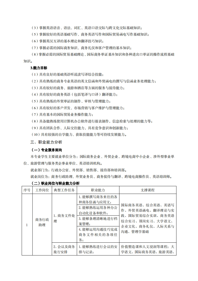 高等职业教育《应用英语》专业人才培养方案(普招三年制)(商务英语方向)专业代码:570202一、学制及招生对象(一)学制:三年。(二)招生对象:高中(中职)毕业生。(三)招生类型:文理兼收。二、培养目标与人才规格(一)培养目标本专业培养德智体美劳全面发展,具有较高综合素质、良好职业道德、创新精神和创业意识,掌握英语语言基础知识和国际商务与贸易理论基础知识,具备较强的英语语言听、说、读、写、译的综合应用能力、商务接待与翻译能力和国际贸易操作能力,在商务和国际贸易企业从事商务接待和外贸工作的生产、建设、服务与管理第一线需要的高素质技术技能人才。(二)人才规格1.素质目标(1)思想政治素质:系统掌握马克思主义基本原理和马克思主义中国化理论成果,了解党史新中国史、改革开放史、社会主义发展史,认识世情、国情、党情,深刻领会习近平新时代中国特色社会主义思想,培养运用马克思主义立场观点方法分析和解决问题的能力:自觉践行社会主义核心价值观,尊重和维护宪法法律权威,识大局、尊法治、修美德:矢志不渝听党话跟党走,争做社会主义合格建设者和可靠接班人。(2)职业素质:具有良好的职业安全、环境保护意识、职业道德、创新精神、创业意识,能够立足生产、建设、管理、服务一线,踏实进取,敬业奉献,善于合作,敢于竞争,勇于创新。(3)人文科学素质:具有宽阔的视野、良好的科学思维品质、高雅的审美情趣和正确的审美观;能够正确认识社会、主动适应社会,有较强文字和语言表达能力,有较强的人际交往能力和自我发展能力。(4)身体心理索质:具有健康的身体,良好的生活习惯,爱好体育运动,有一定的运动基础。具有健康积极的人生态度,良好的个性心理品质,有较强的心理调适能力和抗挫折能力。2.知识目标(1)掌握必备的文化基础知识和人文社会科学知识:(2)掌握计算机应用的基本知识: