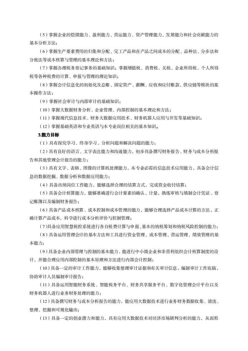 高等职业教育《大数据与会计》专业人才培养方案(普招三年制)专业代码:530302一、学制及招生对象(一)学制:三年。(二)招生对象:高中(中职)毕业生。(三)招生类型:文理兼收。二、培养目标与人才规格(一)培养目标本专业培养德智体美劳全面发展,具有较高综合素质、良好职业道德、创新精神和创业意识,掌握大数据技术、智能财务、智能税务、财务管理、会计信息系统操作与维护等相关理论知识,具备财务大数据的处理、分析与应用能力,在各类企业、行政、事业单位从事会计核算、企业财务大数据分析、会计信息管理及税务管理等工作的生产、建设、服务和管理第一线需要的高素质技术技能人才。(二)人才规格1.素质目标(1)思想政治素质:系统掌握马克思主义基本原理和马克思主义中国化理论成果,了解党史、新中国史、改革开放史、社会主义发展史,认识世情、国情、党情,深刻领会习近平新时代中国特色社会主义思想,培养运用马克思主义立场观点方法分析和解决问题的能力:自觉践行社会主义核心价值观,尊重和维护宪法法律权威,识大局、尊法治、修美德:矢志不渝听党话跟党走,争做社会主义合格建设者和可靠接班人。(2)职业素质:具有良好的职业安全、环境保护意识、职业道德、创新精神、创业意识,能够立足生产、建设、管理、服务一线,踏实进取,敬业奉献,善于合作,敢于竞争,勇于创新。(3)人文科学素质:具有宽阔的视野、良好的科学思维品质、高雅的审美情趣和正确的审美观:能够正确认识社会、主动适应社会,有较强文字和语言表达能力,有较强的人际交往能力和自我发展能力。(4)身体心理素质:具有健康的身体,良好的生活习惯,爱好体育运动,有一定的运动基础。具有健康积极的人生态度,良好的个性心理品质,有较强的心理调适能力和抗挫折能力。2.知识目标(1)具有必备的公共文化基础知识和人文社会科学知识:(2)掌握资产、负债、所有者权益、收入、费用和利润的会计核算方法及会计报表的编制方法:(4)掌握会计法、税法等相关财经法律法规的基础知识;掌握会计人员职业道德的基本要求;