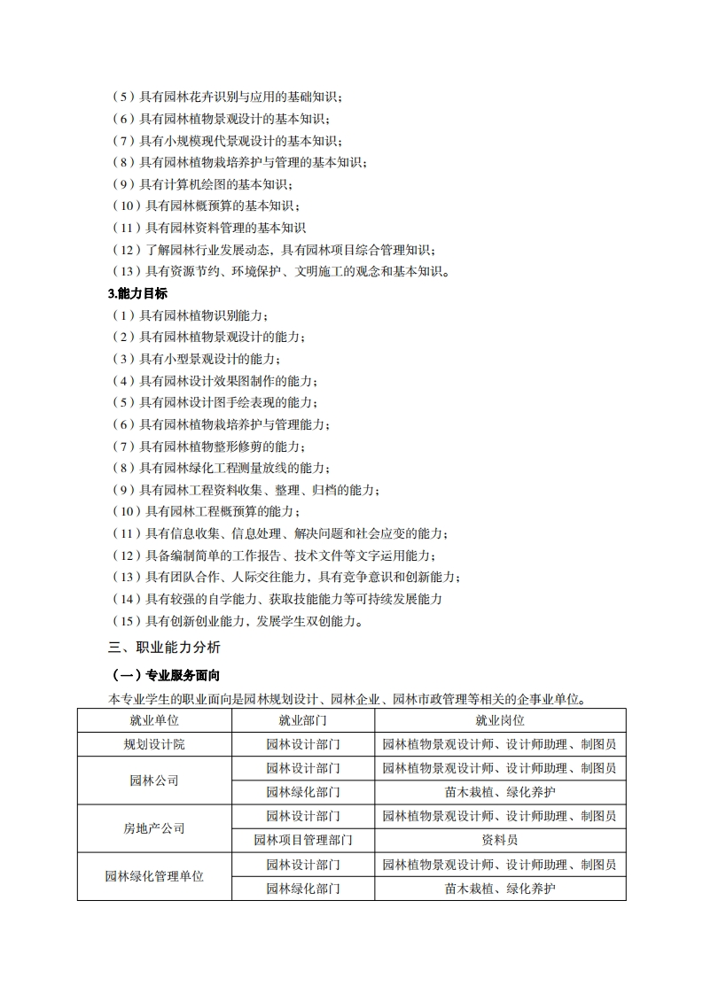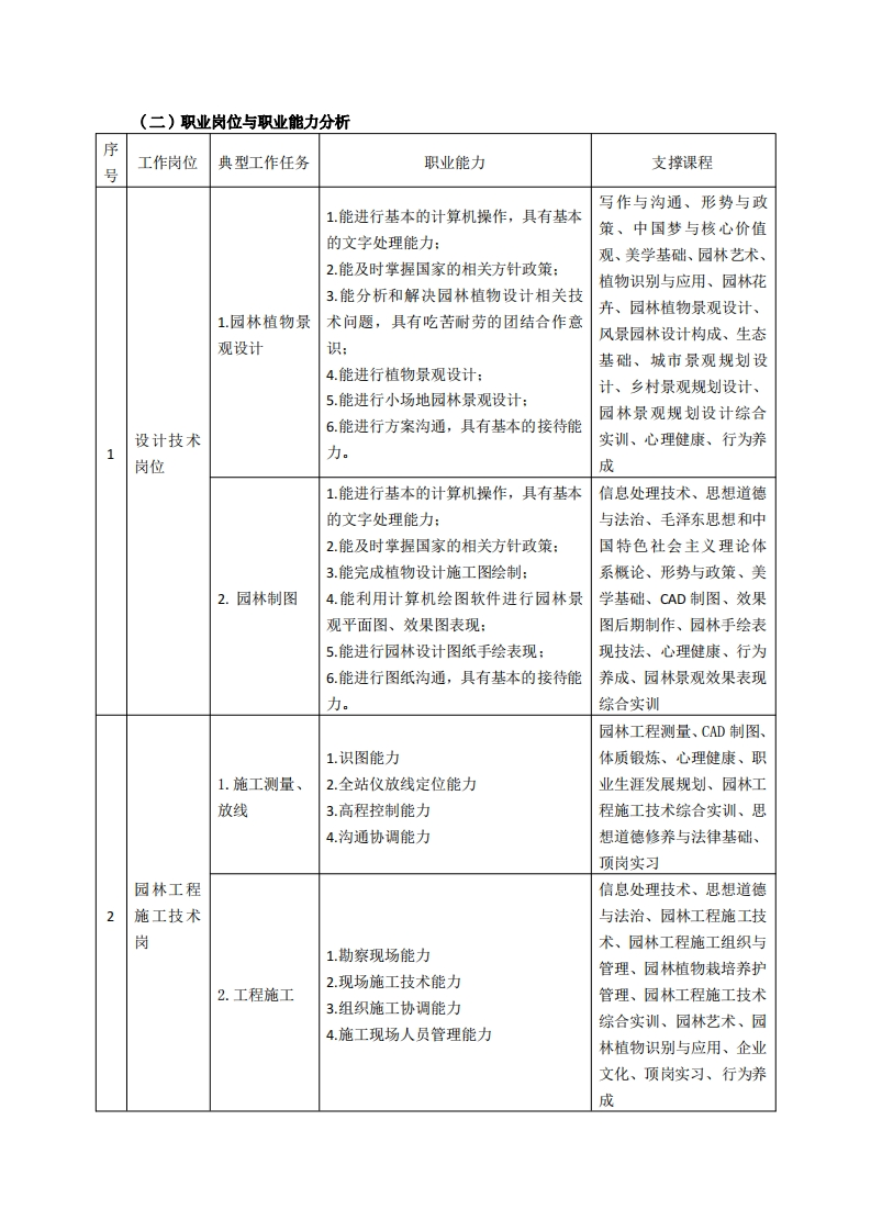 高等职业教育《风景园林设计》专业人才培养方案(普招三年制)专业代码:440105一、学制及招生对象(一)学制:三年。(二)招生对象:高中(中职)毕业生。(三)招生类型:文理兼收。二、培养目标与人才规格(一)培养目标本专业培养德智体美劳全面发展,具有较高综合素质、良好职业道德、创新精神和创业意识,掌握园林植物识别与应用、园林植物景观设计和园林植物栽培管理等专业知识,具备园林植物识别园林植物配置、小规模现代景观设计与绿化工程能力施工等专业能力,在园林相关企事业单位从事园林植物配置设计、小规模现代景观设计、绘图及园林植物栽培与养护工作的生产、建设、服务和管理第一线需要的高素质技术技能人才。(二)人才规格1.素质目标(1)思想政治素质:系统掌握马克思主义基本原理和马克思主义中国化理论成果,了解党史新中国史、改革开放史、社会主义发展史,认识世情、国情、党情,深刻领会习近平新时代中国特色社会主义思想,培养运用马克思主义立场观点方法分析和解决问题的能力;自觉践行社会主义核心价值观,尊重和维护宪法法律权威,识大局、尊法治、修美德;矢志不渝听党话跟党走,争做社会主义合格建设者和可靠接班人。(2)职业素质:具有良好的职业安全、环境保护意识、职业道德、创新精神、创业意识,能够立足生产、建设、管理、服务一线,踏实进取,敬业奉献,善于合作,敢于竞争,勇于创新。(3)人文科学素质:具有宽阔的视野、良好的科学思维品质、高雅的审美情趣和正确的审美观:能够正确认识社会、主动适应社会,有较强文字和语言表达能力,有较强的人际交往能力和自我发展能力。(4)身体心理素质:具有健康的身体,良好的生活习惯,爱好体育运动,有一定的运动基础。具有健康积极的人生态度,良好的个性心理品质,有较强的心理调适能力和抗挫折能力。2.知识目标(1)具有必须的公共英语听、说、读、写基本知识和职业英语知识:(2)具有必备的文化基础知识和人文社会科学知识:(3)具有计算机应用的基本知识:(4)具有园林植物识别与应用的基础知识: