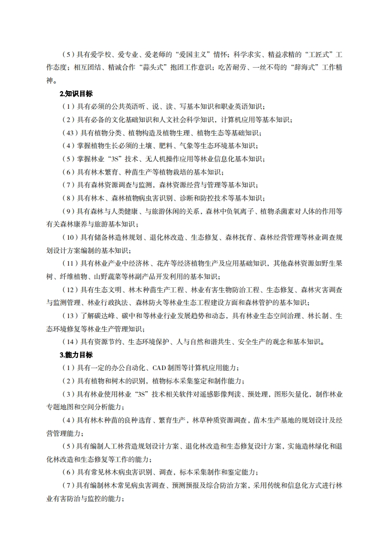 高等职业教育《林业技术》专业人才培养方案(普招三年制)专业代码:410201一、学制及招生对象(一)学制:三年。(二)招生对象:高中(中职)毕业生。(三)招生类型:文理兼收。二、培养目标与人才规格(一)培养目标本专业培养德智体美劳全面发展,具有较高综合素质、良好职业道德、创新精神和创业意识,掌握植物和树木识别、生态基础、种苗繁育、森林资源调查、森林营造、森林资源经营、森林资源管理、林业有害生物控制、森林康养与旅游、林业政策与法规等知识,具备林木种苗生产经营管理」各类人工林营造、林业有害生物控制、林业调查规划设计、森林资源开发管理、生态工程建设等能力。在各级林业局、林业站、生态林场、苗木繁育基地、农林科技公司、农林信息科技公司等单位,从事林木种苗生产经营管理、林木良种选育、造林绿化、林木病虫害防治、各类森林和草业资源调查与监测评估、森林资源管理与管护、森林资源开发利用、林业生态工程建设与生态修复工程建设等工作的生产、建设、服务和管理第一线需要的高素质技术技能人才。(二)人才规格1.素质目标(1)思想政治素质:系统掌握马克思主义基本原理和马克思主义中国化理论成果,了解党史、新中国史、改革开放史、社会主义发展史,认识世情、国情、党情,深刻领会习近平新时代中国特色社会主义思想、生态文明思想,培养运用马克思主义立场观点方法分析和解决问题的能力;自觉践行社会主义核心价值观,牢固树立绿水青山就是金山银山的理念,尊重自然、保护自然,坚持节约优先、保护优先,自然恢复为主。尊重和维护宪法法律权威,识大局、尊法治、修美德;矢志不渝听党话跟党走,争做社会主义合格建设者和可靠接班人。(2)职业素质:具有良好的职业安全、环境保护意识、职业道德、创新精神、创业意识,能够立足生产、建设、管理、服务一线,踏实进取,敬业奉献,善于合作,敢于竞争,勇于创新。(3)人文科学素质:具有宽阔的视野、良好的科学思维品质、高雅的审美情趣和正确的审美观:能够正确认识社会、主动适应社会,有较强文字和语言表达能力,有较强的人际交往能力和自我发展能力。(4)身体心理素质:具有健康的身体,良好的生活习惯,爱好体育运动,有一定的运动基础。具有健康积极的人生态度,良好的个性心理品质,有较强的心理调适能力和抗挫折能力。