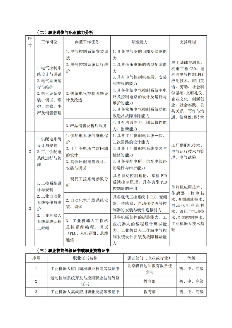 高等职业教育《电气自动化技术》专业人才培养方案(普招三年制)专业代码:460306一、学制及招生对象(一)学制:三年。(二)招生对象:高中(中职)毕业生。(三)招生类型:文理兼收。二、培养目标与人才规格(一)培养目标本专业培养德智体美劳全面发展,具有较高综合素质、良好职业道德、创新精神和创业意识,掌握电气设备及自动化生产线所需的理论知识,具备电气设备运行管理、自动化生产线安装与检修、调试维护、产品销售和技术服务能力,在各大中型生产企业、供用电企业、厂矿企业、事业单位,从事电气设备选型配套、工业自动化控制、电气系统运行及生产、建设、服务和管理等一线需要的高素质技术技能人才。(二)人才规格1.素质目标(1)思想政治素质:系统掌握马克思主义基本原理和马克思主义中国化理论成果,了解党史、新中国史、改革开放史、社会主义发展史,认识世情、国情、党情,深刻领会习近平新时代中国特色社会主义思想,培养运用马克思主义立场观点方法分析和解决问题的能力:自觉践行社会主义核心价值观,尊重和维护宪法法律权威,识大局、尊法治、修美德:矢志不渝听党话跟党走,争做社会主义合格建设者和可靠接班人。(2)职业素质:具有良好的职业安全、环境保护意识、职业道德、创新精神、创业意识,能够立足生产、建设、管理、服务一线,踏实进取,敬业奉献,善于合作,敢于竞争,勇于创新。(3)人文科学素质:具有宽阔的视野、良好的科学思维品质、高雅的审美情趣和正确的审美观:能够正确认识社会、主动适应社会,有较强文字和语言表达能力,有较强的人际交往能力和自我发展能力。(4)身体心理素质:具有健康的身体,良好的生活习惯,爱好体育运动,有一定的运动基础。具有健康积极的人生态度,良好的个性心理品质,有较强的心理调适能力和抗挫折能力。2.知识目标(1)具有必须的公共英语听、说、读、写基本知识和职业英语知识:(2)具有必备的文化基础知识和人文社会科学知识:(3)具有计算机应用的基本知识: