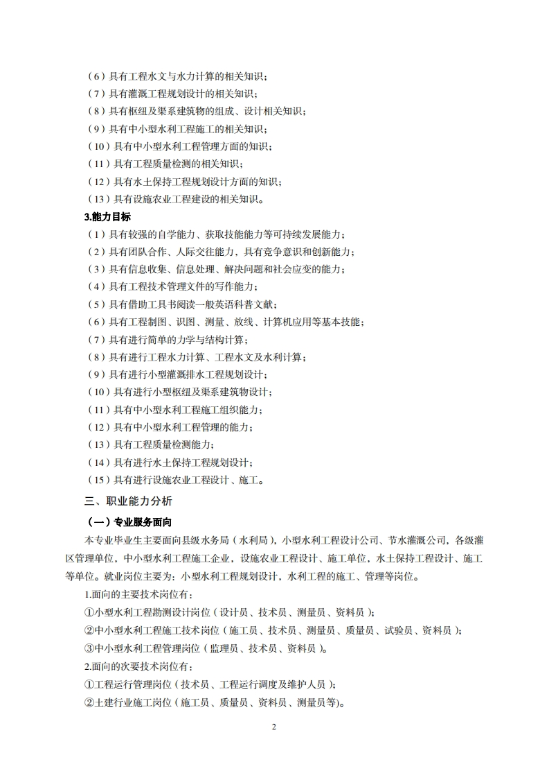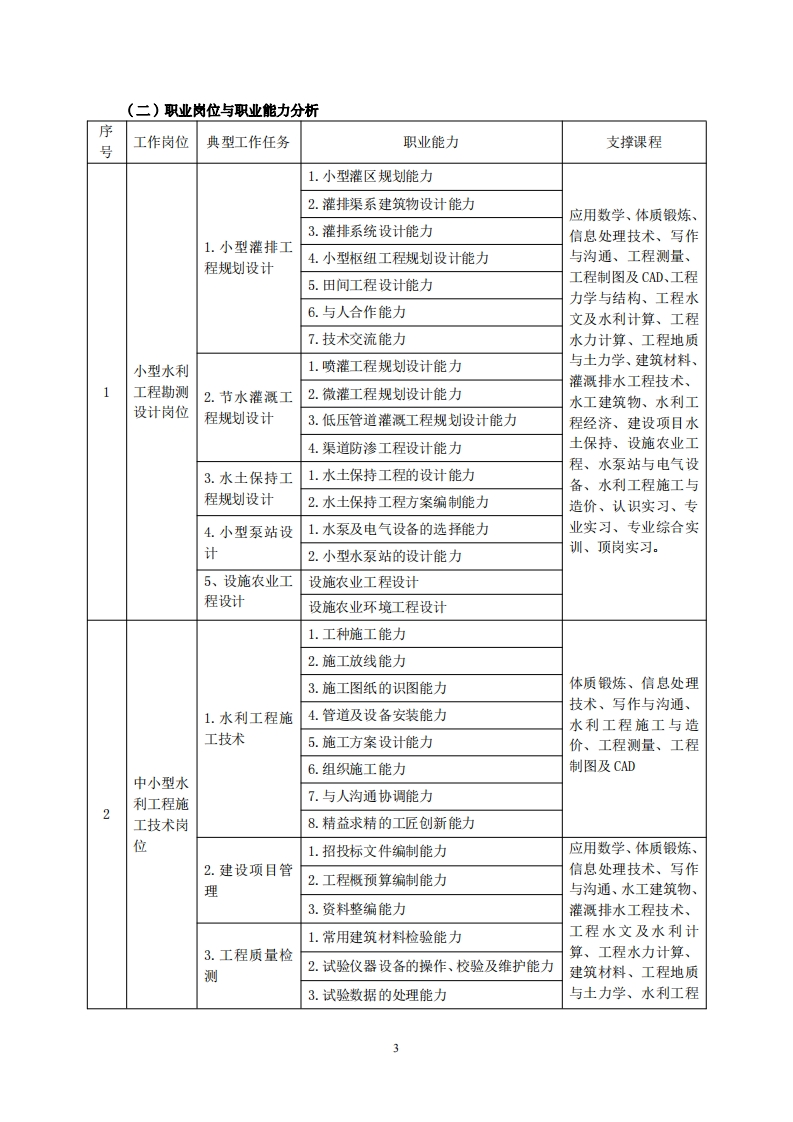 高等职业教育《水利工程》专业人才培养方案(普招三年制)专业代码:450201一、学制及招生对象(一)学制:三年。(二)招生对象:高中(中职)毕业生。(三)招生类型:理科。二、培养目标与人才规格(一)培养目标本专业培养德智体美劳全面发展,掌握扎实的科学文化基础和农田灌排、节水灌溉、河道生态治理、乡镇供排水等知识及相关法律法规,具备小型水利工程规划设计能力,中小型水利工程施工管理能力,具有工匠精神和信息素养,能够从事农田灌排、节水灌溉、河道生态治理、乡镇供排水等水利工程规划设计、施工、运行管理等工作的高素质技术技能人才。(二)人才规格1.素质目标(1)思想政治素质:系统掌握马克思主义基本原理和马克思主义中国化理论成果,了解党史、新中国史、改革开放史、社会主义发展史,认识世情、国情、党情,深刻领会习近平新时代中国特色社会主义思想,培养运用马克思主义立场观点方法分析和解决问题的能力;自觉践行社会主义核心价值观,尊重和维护宪法法律权威,识大局、尊法治、修美德:矢志不渝听党话跟党走,争做社会主义合格建设者和可靠接班人。(2)职业素质:具有良好的职业安全、环境保护意识、职业道德、创新精神、创业意识,能够立足生产、建设、管理、服务一线,踏实进取,敬业奉献,善于合作,敢于竞争,勇于创新。(3)人文科学素质:具有宽阔的视野、良好的科学思维品质、高雅的审美情趣和正确的审美观:能够正确认识社会、主动适应社会,有较强文字和语言表达能力,有较强的人际交往能力和自我发展能力。(4)身体心理素质:具有健康的身体,良好的生活习惯,爱好体育运动,有一定的运动基础。具有健康积极的人生态度,良好的个性心理品质,有较强的心理调适能力和抗挫折能力。2.知识目标(1)具有公共英语听、说、读、写基本知识和职业英语知识:(2)具有必备的文化基础知识和人文社会科学知识:(3)具有计算机应用的基本知识:(4)具有工程制图及测量基本知识:(5)具有工程力学与结构设计的相关知识: