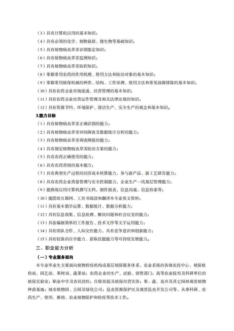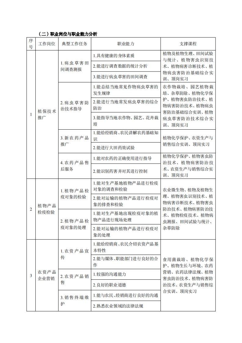 高等职业教育《植物保护与检疫技术》专业人才培养方案(普招三年制)专业代码:410106一、学制及招生对象(一)学制:三年。(二)招生对象:高中(中职)毕业生。(三)招生类型:文理兼收。二、培养目标与人才规格(一)培养目标本专业培养德智体美劳全面发展,具有较高综合素质、良好职业道德、创新精神和创业意识掌握植物病虫草害识别、调查、预测预报与防治的基本知识,具备农作物有害生物的诊断与综合防治、农药的应用与营销、植物检疫及检疫处理等方面的基本技能,能在农业及相关企事业单位从事植物病、虫、草害诊断、防治,以及农资产品的生产销售、技术推广等工作的生产、建设、服务和管理第一线需要的高素质技术技能人才。(二)人才规格1.素质目标(1)思想政治素质:系统掌握马克思主义基本原理和马克思主义中国化理论成果,了解党史、新中国史、改革开放史、社会主义发展史,认识世情、国情、党情,深刻领会习近平新时代中国特色社会主义思想,培养运用马克思主义立场观点方法分析和解决问题的能力:自觉践行社会主义核心价值观,尊重和维护宪法法律权威,识大局、尊法治、修美德;矢志不渝听党话跟党走,争做社会主义合格建设者和可靠接班人。(2)职业素质:具有良好的职业安全、环境保护意识、职业道德、创新精神、创业意识,能够立足生产、建设、管理、服务一线,踏实进取,敬业奉献,善于合作,敢于竞争,勇于创新。(3)人文科学素质:具有宽阔的视野、良好的科学思维品质、高雅的审美情趣和正确的审美观;能够正确认识社会、主动适应社会,有较强文字和语言表达能力,有较强的人际交往能力和自我发展能力。(4)身体心理素质:具有健康的身体,良好的生活习惯,爱好体育运动,有一定的运动基础。具有健康积极的人生态度,良好的个性心理品质,有较强的心理调适能力和抗挫折能力。2.知识目标(1)具有必须的公共英语听、说、读、写基本知识和职业英语知识:(2)具有必备的文化基础知识和人文社会科学知识: