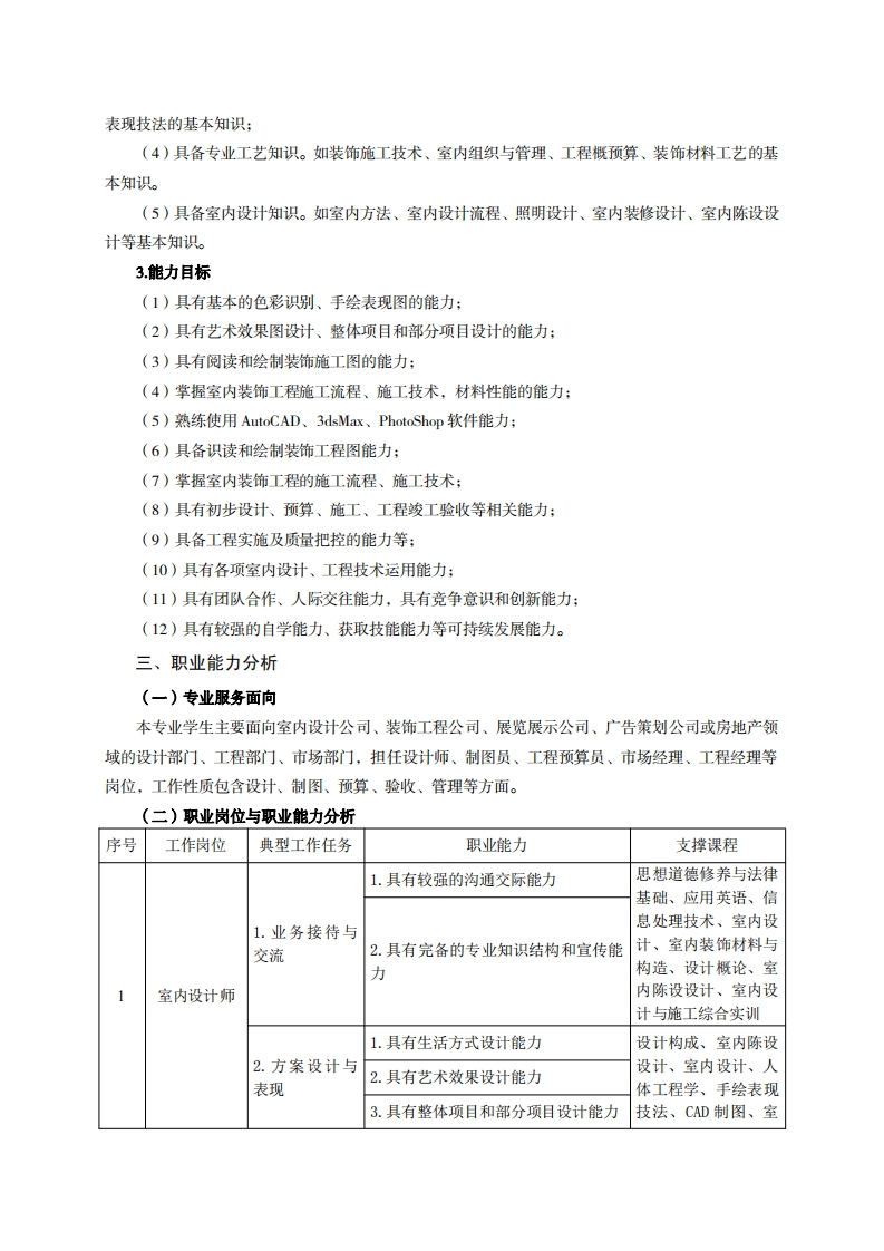 高等职业教育《建筑室内设计》专业人才培养方案(普招三年制)专业代码:440106一、学制及招生对象(一)学制:三年。(二)招生对象:高中毕业生。(三)招生类型:文理兼收。二、培养目标与人才规格(一)培养目标本专业培养德智体美劳全面发展,具有较高综合素质、良好职业道德、创新精神和创业意识,掌握室内设计、室内装饰工程施工流程、施工技术、绘图软件、艺术效果图设计、预算等知识,具备室内设计、工程技术运用能力,能在建筑室内设计公司、室内装饰公司、展览展示公司及建筑房地产等领域,从事室内设计、电脑设计图纸表现、展览展示设计、装饰工程预决算及施工组织与管理需要的高素质技术技能人才。(二)人才规格1.素质目标(1)思想政治素质:系统掌握马克思主义基本原理和马克思主义中国化理论成果,了解党史、新中国史、改革开放史、社会主义发展史,认识世情、国情、党情,深刻领会习近平新时代中国特色社会主义思想,培养运用马克思主义立场观点方法分析和解决问题的能力:自觉践行社会主义核心价值观,尊重和维护宪法法律权威,识大局、尊法治、修美德:矢志不渝听党话跟党走,争做社会主义合格建设者和可靠接班人。(2)职业素质:具有良好的职业安全、环境保护意识、职业道德、创新精神、创业意识,能够立足生产、建设、管理、服务一线,踏实进取,敬业奉献,善于合作,敢于竞争,勇于创新。(3)人文科学素质:具有宽阔的视野、良好的科学思维品质、高雅的审美情趣和正确的审美观:能够正确认识社会、主动适应社会,有较强文字和语言表达能力,有较强的人际交往能力和自我发展能力。(4)身体心理素质:具有健康的身体,良好的生活习惯,爱好体育运动,有一定的运动基础。具有健康积极的人生态度,良好的个性心理品质,有较强的心理调适能力和抗挫折能力。2.知识目标(1)具备文化基础知识和人文社会科学知识。如:语文、英语、计算机应用的基本知识:(2)具备专业基础知识。如:设计素描、设计概论、三大构成的基本知识;(3)具备专业技术知识。如:工程制图、AutoCAD制图、3DsMx制图、图形图像处理、手绘