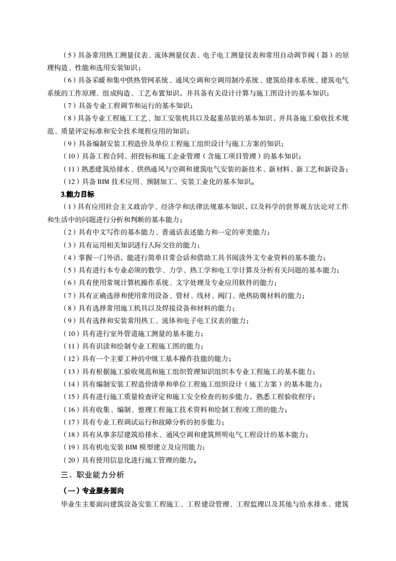 高等职业教育《建筑设备工程技术》专业人才培养方案(普招三年制)专业代码:440401一、学制及招生对象(一)学制:三年。(二)招生对象:高中(中职)毕业生。(三)招生类型:文理兼收。二、培养目标与人才规格(一)培养目标本专业培养德智体美劳全面发展,具有较高综合素质、良好职业道德、创新精神和创业意识,掌握建筑给水排水、暖通空调及电气等系统基础理论和专业知识,具备建筑设备工程施工较强的操作技能和技术应用能力,在设备安装施工员、设备安装质量员、建筑信息模型(BM)技术员等岗位,从事建筑给水排水、供热通风与空调、建筑电气工程的施工组织策划、施工技术管理、施工信息资料管理、工程造价及中小型建筑设备系统设计等工作第一线需要的高素质技术技能人才。(二)人才规格1.素质目标(1)思想政治素质:系统掌握马克思主义基本原理和马克思主义中国化理论成果,了解党史、新中国史、改革开放史、社会主义发展史,认识世情、国情、党情,深刻领会习近平新时代中国特色社会主义思想,培养运用马克思主义立场观点方法分析和解决问题的能力:自觉践行社会主义核心价值观,尊重和维护宪法法律权威,识大局、尊法治、修美德;矢志不渝听党话跟党走,争做社会主义合格建设者和可靠接班人。(2)职业素质:具有良好的职业安全、环境保护意识、职业道德、创新精神、创业意识,能够立足生产、建设、管理、服务一线,踏实进取,敬业奉献,善于合作,敢于竞争,勇于创新。(3)人文科学素质:具有宽阔的视野、良好的科学思维品质、高雅的审美情趣和正确的审美观;能够正确认识社会、主动适应社会,有较强文字和语言表达能力,有较强的人际交往能力和自我发展能力。(4)身体心理索质:具有健康的身体,良好的生活习惯,爱好体育运动,有一定的运动基础。具有健康积极的人生态度,良好的个性心理品质,有较强的心理调适能力和抗挫折能力。2.知识目标(1)具有必须的公共英语听、说、读、写基本知识和职业英语知识;(2)具有必备的文化基础知识和人文社会科学知识:(3)具有计算机应用的基本知识:(4)具备必需的数学、流体力学、热工基础、电工电子、信息技术、建筑工程法律法规知识:
