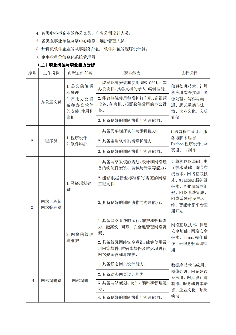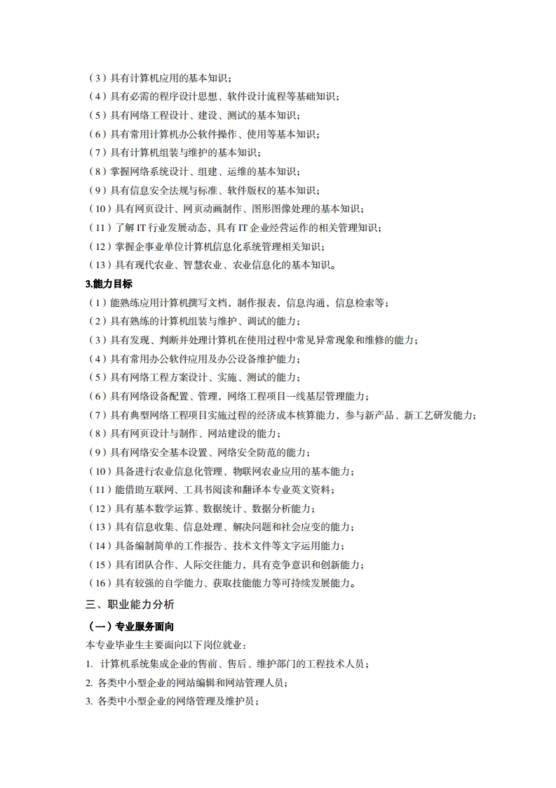 高等职业教育《计算机应用技术》专业人才培养方案(统招三年制)专业代码:510201一、学制及招生对象(一)学制:三年。(二)招生对象:高中(中职)毕业生。(三)招生类型:文理兼收。二、培养目标与人才规格(一)培养目标本专业培养德智体美劳全面发展,具有较高综合素质、良好职业道德、创新精神和创业意识,掌握计算机组成、网络基本原理、网络管理、网站建设、网络安全相关知识,具备常用办公软件应用、计算机组装与维护、网络组建与维护、网站建设与维护、网络管理能力,在各个与计算机相关的行业领域,从事计算机办公自动化应用、计算机销售与售后服务、网络组建、网络维护与管理、网页设计与制作、网站维护与管理等工作的生产、建设、服务和管理第一线需要的高素质技术技能人才。(二)人才规格1.素质目标(1)思想政治素质:系统掌握马克思主义基本原理和马克思主义中国化理论成果,了解党史、新中国史、改革开放史、社会主义发展史,认识世情、国情、党情,深刻领会习近平新时代中国特色社会主义思想,培养运用马克思主义立场观点方法分析和解决问题的能力;自觉践行社会主义核心价值观,尊重和维护宪法法律权威,识大局、尊法治、修美德;矢志不渝听党话跟党走,争做社会主义合格建设者和可靠接班人。(2)职业素质:具有良好的职业安全、环境保护意识、职业道德、创新精神、创业意识,能够立足生产、建设、管理、服务一线,踏实进取,敬业奉献,善于合作,敢于竞争,勇于创新。(3)人文科学素质:具有宽阔的视野、良好的科学思维品质、高雅的审美情趣和正确的审美观:能够正确认识社会、主动适应社会,有较强文字和语言表达能力,有较强的人际交往能力和自我发展能力。(4)身体心理素质:具有健康的身体,良好的生活习惯,爱好体育运动,有一定的运动基础。具有健康积极的人生态度,良好的个性心理品质,有较强的心理调适能力和抗挫折能力。2.知识目标(1)具有必须的公共英语听、说、读、写基本知识和职业英语知识;(2)具有必备的文化基础知识和人文社会科学知识:
