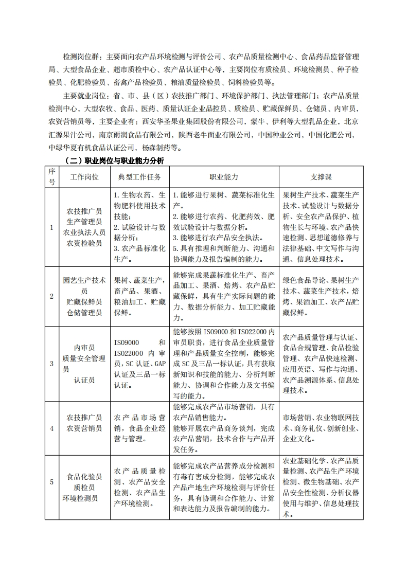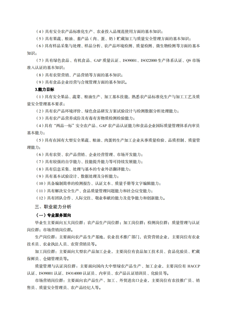 高等职业教育《绿色食品生产技术》专业人才培养方案(普招三年制)专业代码:410115一、学制及招生对象(一)学制:三年。(二)招生对象:高中(中职)毕业生。(三)招生类型:文理兼收。二、培养目标与人才规格(一)培养目标本专业培养德智体美劳全面发展,具有较高综合素质、良好职业道德、创新精神和创业意识,掌握绿色食品标准化生产、绿色食品安全贮藏与运输、农产品质量管理与认证、食品质量安全与控制、农产品环境检测与评价、农产品质量检测及农产品安全性检测等方面知识,具有农产品标准化生产、加工、质量管理、检测与认证等核心技能,熟悉国家有关农产品质量安全的法律法规,能够在农产品生产、加工、检测、认证、市场营销一线从事生产、加工、检测与认证、环境评价、质量安全管理等工作的生产、建设、服务和管理第一线需要的高素质技术技能人才。(二)人才规格1.素质目标(1)思想政治素质:系统掌握马克思主义基本原理和马克思主义中国化理论成果,了解党史、新中国史、改革开放史、社会主义发展史,认识世情、国情、党情,深刻领会习近平新时代中国特色社会主义思想,培养运用马克思主义立场观点方法分析和解决问题的能力:自觉践行社会主义核心价值观,尊重和维护宪法法律权威,识大局、尊法治、修美德:矢志不渝听党话跟党走,争做社会主义合格建设者和可靠接班人。(2)职业素质:具有良好的职业安全、环境保护意识、职业道德、创新精神、创业意识,能够立足生产、建设、管理、服务一线,踏实进取,敬业奉献,善于合作,敢于竞争,勇于创新。(3)人文科学素质:具有宽阔的视野、良好的思维品质、高雅的审美情趣和正确的审美观;能够正确认识社会、主动适应社会,有较强文字和语言表达能力,有较强的人际交往能力和自我发展能力。(4)身体心理素质:具有健康的身体,良好的生活习惯,爱好体育运动,具有健康积极的人生态度,良好的个性心理品质,有较强的心理调适能力和抗挫折能力。2.知识目标(1)具有必备的政治理论、数据分析基础,以及社会与人文知识:(2)具有计算机应用、英语、信息采集与处理等方面的基本知识:(3)具有农业基础化学、植物学、土壤学、微生物学基本知识: