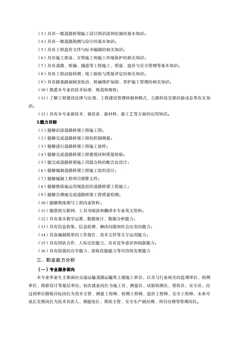 高等职业教育《道路与桥梁工程技术》专业人才培养方案(普招三年制)专业代码:500201一、学制及招生对象(一)学制:三年。(二)招生对象:高中(中职)毕业生。(三)招生类型:理科。二、培养目标与人才规格(一)培养目标本专业培养德智体美劳全面发展,具有较高综合素质、良好职业道德、创新精神和创业意识,掌握道路桥梁工程施工设计图纸识读和绘制、路线勘测与设计、道桥工程施工、质量与安全管理等基本知识,具备道路桥梁工程施工图识读和绘制、施工测量放样、建筑材料质量检验、施工组织与管理、质量检查与验收的能力,在公路建设施工管理一线企业从事道路桥梁工程技术工作的生产、建设、服务和管理第一线需要的高素质技术技能人才。(二)人才规格1.素质目标(1)思想政治素质:系统掌握马克思主义基本原理和马克思主义中国化理论成果,了解党史、新中国史、改革开放史、社会主义发展史,认识世情、国情、党情,深刻领会习近平新时代中国特色社会主义思想,培养运用马克思主义立场观点方法分析和解决问题的能力:自觉践行社会主义核心价值观,尊重和维护宪法法律权威,识大局、尊法治、修美德:矢志不渝听党话跟党走,争做社会主义合格建设者和可靠接班人。(2)职业素质:具有良好的职业安全、环境保护意识、职业道德、创新精神、创业意识,能够立足生产、建设、管理、服务一线,踏实进取,敬业奉献,善于合作,敢于竞争,勇于创新。(3)人文科学素质:具有宽阔的视野、良好的科学思维品质、高雅的审美情趣和正确的审美观:能够正确认识社会、主动适应社会,有较强文字和语言表达能力,有较强的人际交往能力和自我发展能力。(4)身体心理素质:具有健康的身体,良好的生活习惯,爱好体育运动,有一定的运动基础。具有健康积极的人生态度,良好的个性心理品质,有较强的心理调适能力和抗挫折能力。2.知识目标(1)具有必要的思想政治理论知识、法律基础知识、计算机应用知识和一定的人文社会科学知识:(2)具有必须的公共英语听、说、读、写基本知识和职业英语知识: