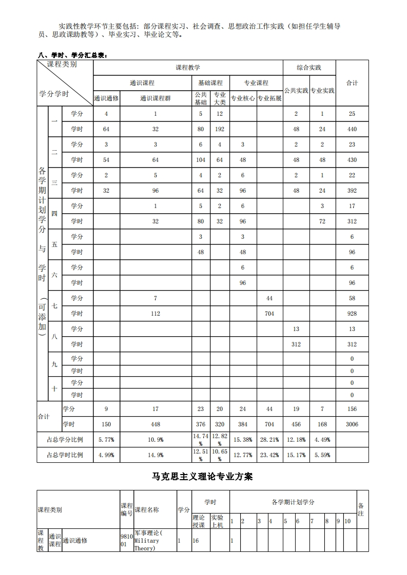马克思主义理论专业方案Training Program of(专业代码:3902)一、培养目标本专业以“厚基础、宽口径、高素质、强能力”为原则,培养从整体上系统掌握马克思主义基本原理、历史演进、当代发展,具有马克思主义信仰和社会主义信念,德智体美劳全面发展,在马克思主义理论以及思想政治教育理论方面基础扎实、政治坚定、品德高尚、知识面宽、综合素质高,具有创新精神和实践能力的复合型高级专门人才,毕业生既能在学校和科研机构从事本专业的教学、研究工作,又能在党政机关和企事业单位以本专业为基础的宣传、组织、管理、思想政治工作的人才。二、基本要求本专业主要学习马克思列宁主义、毛泽东思想和中国特色社会主义理论体系,学习思想政治教育专业的基本理论和基本知识,受到思想政治教育专业技能与方法的基本训练,掌握从事思想政治工作的基本能力和科学研究能力。本专业毕业生应获得以下几个方面的知识和能力:1.具有在马克思主义理论领域从事料学研究,理论宣传所需要的基础知识。2.掌握马克思主义理论类相关的基础理论,具有基本的经典理论,理论探讨能力,具有系统的与马克思主义理论类专业相关的社会实践经历,了解马克思主义理论在当今时代社会生活方方面面所面临的问题,了解其未来的趋势。3.草握基本的创新方法,初步具备社会调查数据分析的能力,在社会实践过程中能够综合考虑,政治,经济,文化,社会等多方面制约因素,形成科学判断的基本能力。4.草握文献检索,资料查询及运用现代信息技术获取相关信总的基本方法,具备社会科学论文写作基本能力。三、主干学科马克思主义理论、政治学、教有学、伦理学、马克思主义哲学、思想政治教有学。四、主要课程马克思主义经典著作导读、马克思主义发展史、思想政治教有学原理、思想政治教育方法论、马克思主义基本原理,习近平新时代中国特色主义思想专题等。五、学制、修业年限及授子学位专业学制4年,弹性修业年限3~6年,符合郑州大学授予学士学位规定,授予法学学士学位。六、毕业学分要求本专业须修满培养方案中规定课程157学分(其中通识课23学分,基础课39学分,专业核心课21学分,专业拓展课3学分),必修课程全部合格,英语水平达到学校要求,方准毕业。七、主要实践性教学环节