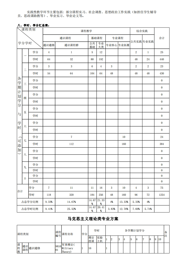 马克思主义理论类专业方案Training Program of(专业代码:3903)一、培养目标本专业以“厚基础、宽口径、高素质、强能力”为原则,培养从整体上系统掌握马克思主义基本原理、历史演进、当代发展,具有马克思主义信仰和社会主义信念,德智体美劳全面发展,在马克思主义理论以及思想政治教育理论方面基础扎实、政治坚定、品德高尚、知识面宽、综合素质高,具有创新精神和实践能力的复合型高级专门人才,毕业生既能在学校和科研机构从事本专业的教学、研究工作,又能在党政机关和企事业单位以本专业为基础的宣传、组织、管理、思想政治工作的人才。二、基本要求本专业主要学习马克思列宁主义、毛泽东思想和中国特色社会主义理论体系,学习思想政治教育专业的基本理论和基本知识,受到思想政治教育专业技能与方法的基本训练,掌握从事思想政治工作的基本能力和科学研究能力。本专业毕业生应获得以下几个方面的知识和能力:1.具有在马克思主义理论领域从事料学研究,理论宣传所需要的基础知识。2.掌握马克思主义理论类相关的基础理论,具有基本的经典理论,理论探讨能力,具有系统的与马克思主义理论类专业相关的社会实践经历,了解马克思主义理论在当今时代社会生活方方面面所面临的问题,了解其未来的趋势。3.掌握基本的创新方法,初步具备社会调查数据分析的能力,在社会实践过程中能够综合考虑,政治,经济,文化,社会等多方面制约因素,形成科学判断的基本能力。4.草握文献检索,资料查询及运用现代信息技术获取相关信总的基本方法,具备社会科学论文写作基本能力。三、主干学科马克思主义理论、政治学、教有学、伦理学、马克思主义哲学、思想政治教有学。四、主要课程马克思主义经典著作导读、马克思主义发展史、思想政治教有学原理、思想政治教育方法论、马克思主义基本原理,习近平新时代中国特色主义思想专题等。五、学制、修业年限及授子学位专业学制4年,弹性修业年限3~6年,符合郑州大学授予学士学位规定,授予法学学士学位。六、毕业学分要求本专业须修满培养方案中规定课程157学分(其中通识课23学分,基础课39学分,专业核心课21学分,专业拓展课3学分),必修课程全部合格,英语水平达到学校要求,方准毕业。七、主要实践性教学环节