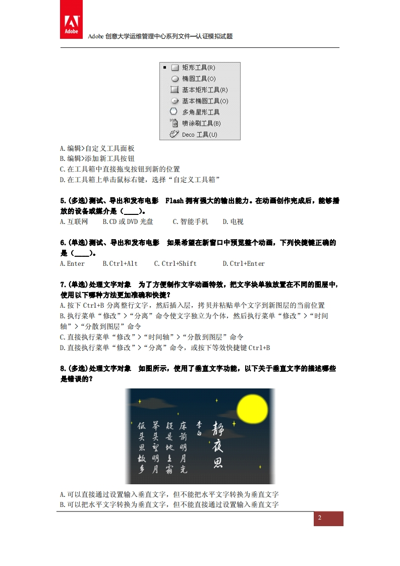 Adobe创意大学计划FlashCS4模拟试题348072@abc昨天发布关注私信2.15MB20页044Adobe创意大学计划FlashCS4模拟试题此内容为付费资源,请付费后查看¥9¥19黄金会员免费钻石会员免费立即购买您当前未登录!建议登陆后购买,可保存购买订单付费资源 第1页 / 共20页 第2页 / 共20页 第3页 / 共20页 试读已结束,还剩17页,您可下载完整版后进行离线阅读 THE END网站设计高考真题 文本预览 AAdobeAdobe创意大学计划(Adobe Creative University认证模拟试题Adobe系统软件(北京)有限公司 查看更多 收起部分 喜欢就支持一下吧收藏