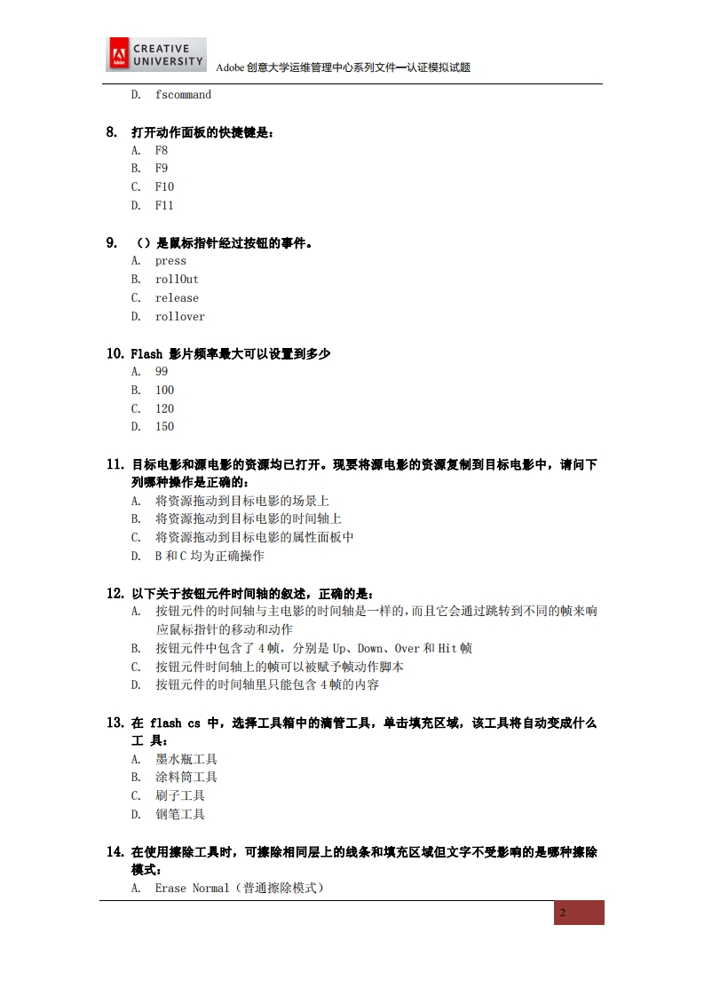 Adobe创意大学计划Flash动画设计师模拟试题348072@abc昨天发布关注私信0.31MB12页032Adobe创意大学计划Flash动画设计师模拟试题此内容为付费资源,请付费后查看¥9¥19黄金会员免费钻石会员免费立即购买您当前未登录!建议登陆后购买,可保存购买订单付费资源 第1页 / 共12页 第2页 / 共12页 第3页 / 共12页 试读已结束,还剩9页,您可下载完整版后进行离线阅读 THE END网站设计高考真题 文本预览 CREATIVEAdobeUNIVERSITYAdobe创意大学计划(Adobe Creative University)认证模拟试题Adobe系统软件(北京)有限公司 查看更多 收起部分 喜欢就支持一下吧收藏