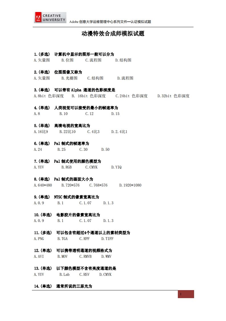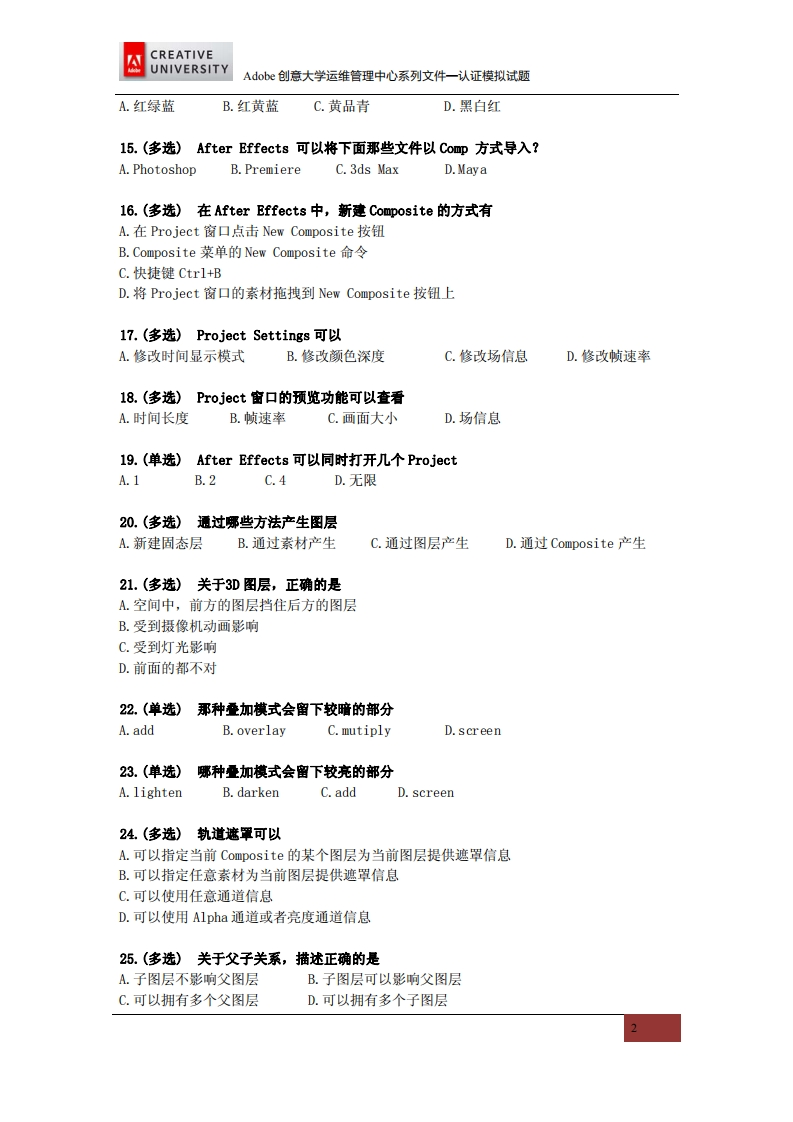 Adobe创意大学计划动漫特效合成师模拟试题348072@abc昨天发布关注私信0.18MB8页043Adobe创意大学计划动漫特效合成师模拟试题此内容为付费资源,请付费后查看¥9¥19黄金会员免费钻石会员免费立即购买您当前未登录!建议登陆后购买,可保存购买订单付费资源 第1页 / 共8页 第2页 / 共8页 第3页 / 共8页 试读已结束,还剩5页,您可下载完整版后进行离线阅读 THE END网站设计高考真题 文本预览 CREATIVEAdobeUNIVERSITYAdobe创意大学计划(Adobe Creative University)认证模拟试题Adobe系统软件(北京)有限公司 查看更多 收起部分 喜欢就支持一下吧收藏