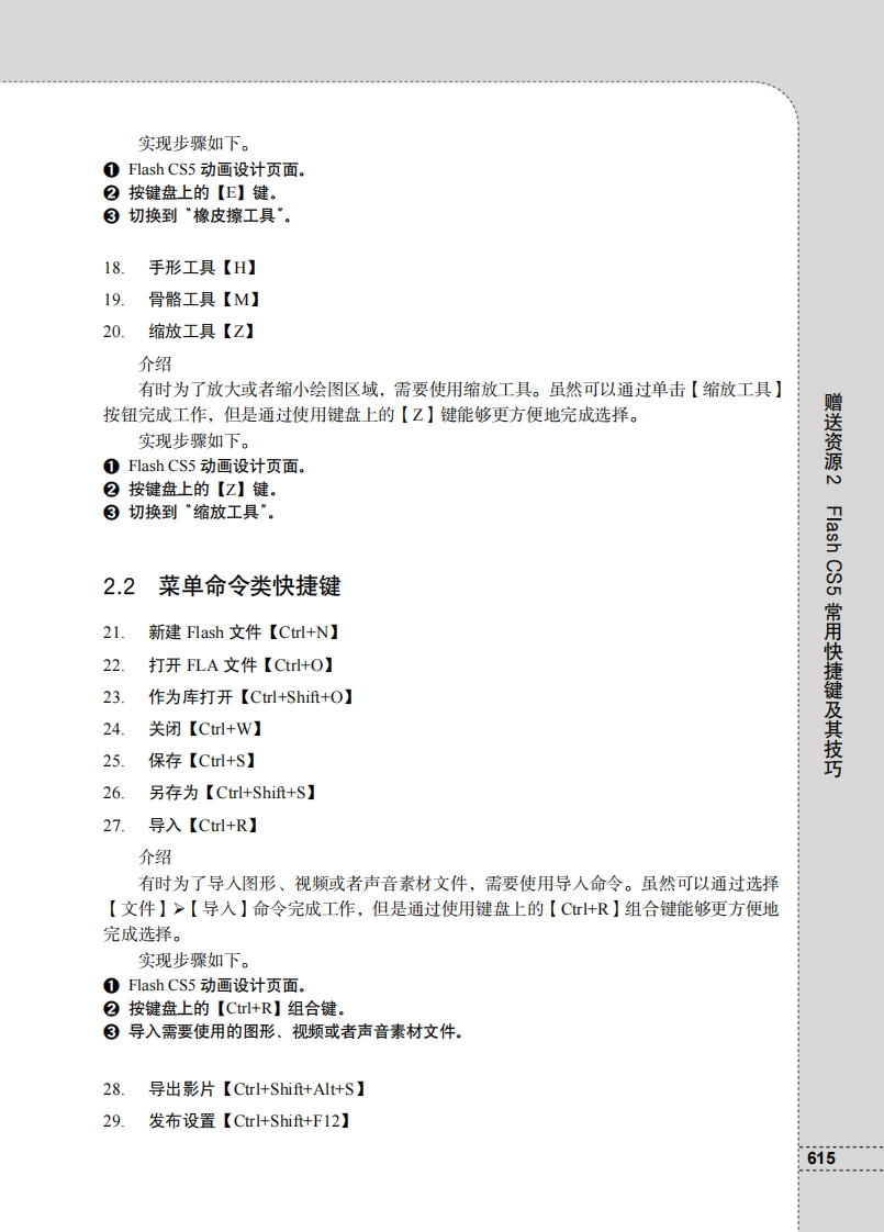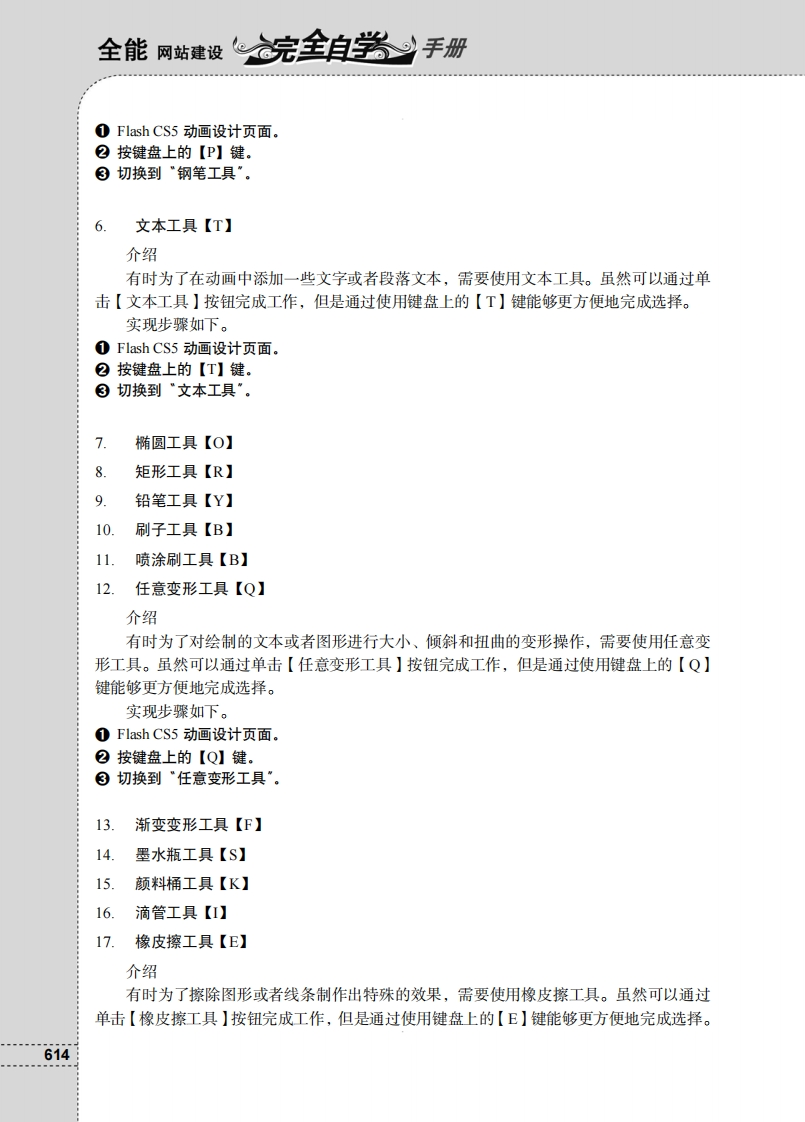 赠送资源2 Flash CS5常用快捷键及其技巧2.1工具类快捷键1.选择工具【V】介绍有时为了选择绘制图形或者调整图形,需要使用选择工具。虽然可以通过单击【选择工具】按钮完成工作,但是通过使用键盘上的【V】键能够更方便地完成选择。实现步骤如下。①Flash CS5动画设计页面。②按键盘上的【V】键。赠送资源③切换到"选择工具”。2.部分选取工具【A】3.线条工具【N】介绍Flash CS5有时为了绘制直线、虚线等线条图形,需要使用线条工具。虽然可以通过单击【线条工具】按钮完成工作,但是通过使用键盘上的【N】键能够更方便地完成选择。常用实现步骤如下。①Flash CS.5动画设计页面.快捷②按键盘上的【N】键。③切换到"线条工具"及其技4.套索工具【L】介绍有时为了选择不规则图形或部分图形,需要使用套索工具。虽然可以通过单击【套索工具】按钮完成工作,但是通过使用键盘上的【L】键能够更方便地完成选择。实现步骤如下。①Flash CS5动画设计页面。②按键盘上的【L】键。③切换到“套索工具“。5.钢笔工具【P】介绍有时为了绘制比较精确的图形或者线条路径,需要使用钢笔工具。虽然可以通过单击【钢笔工具】按钮完成工作,但是通过使用键盘上的【P】键能够更方便地完成选择。实现步骤如下。613